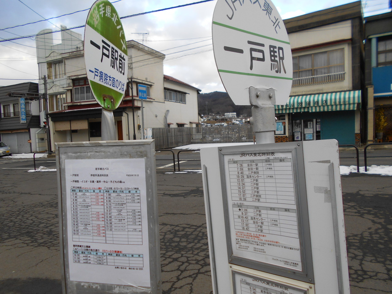 駅の外には岩手県北バスとJRバス東北の停留場が並んで設置されています。