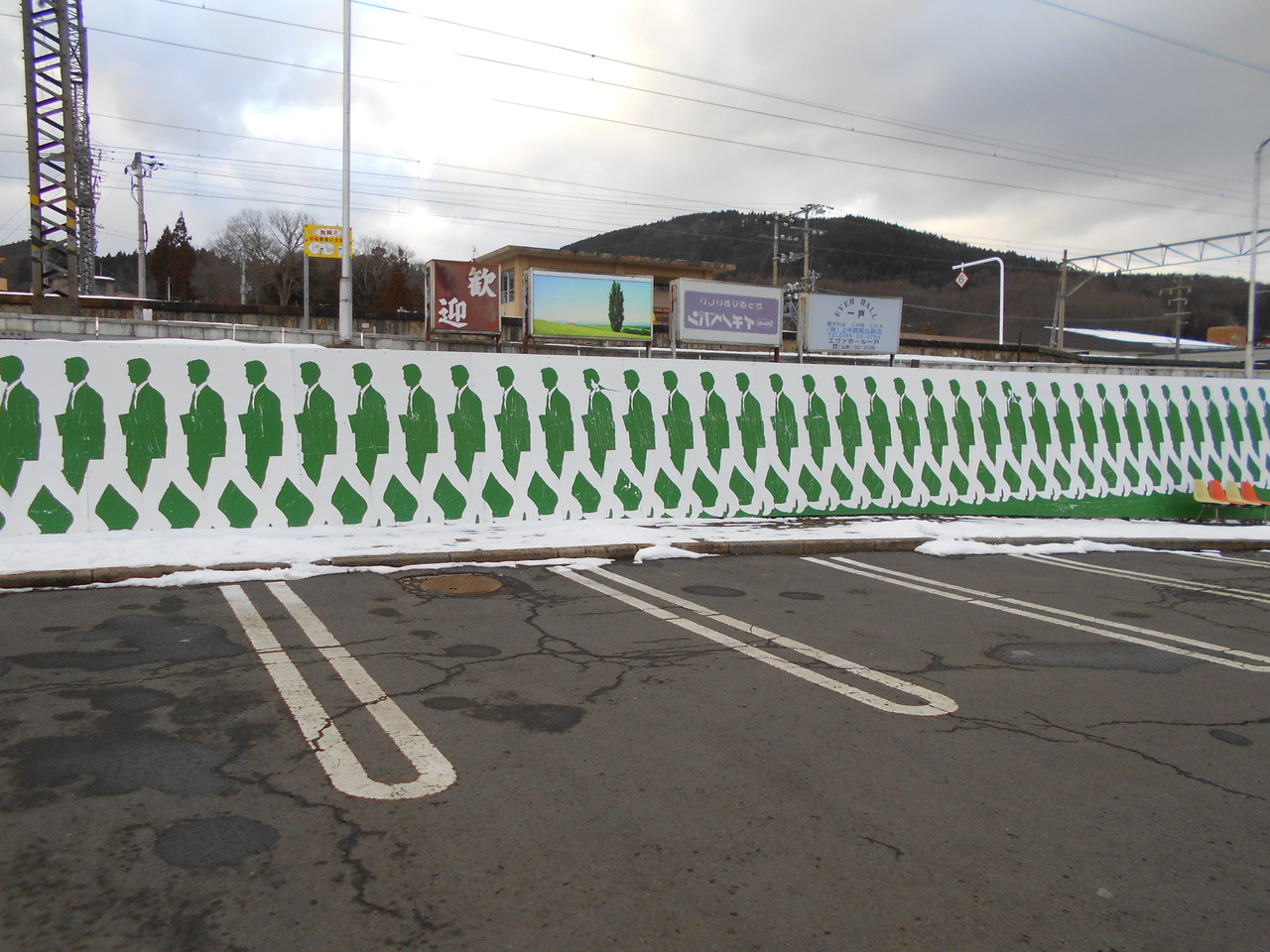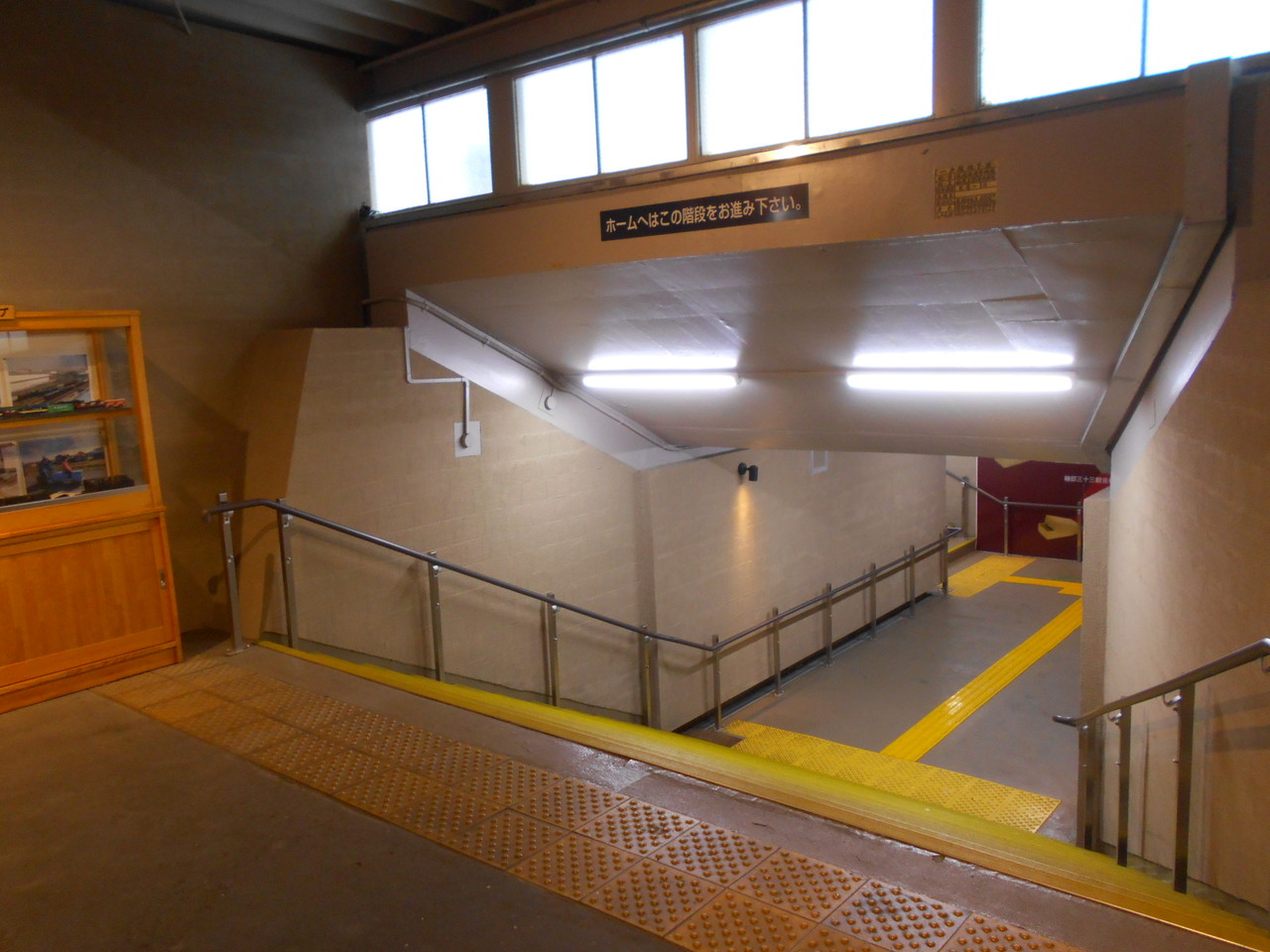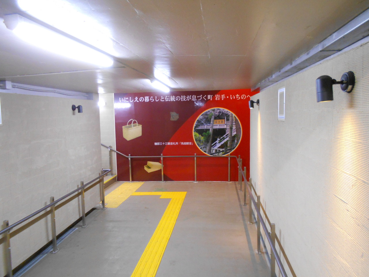 駅舎リニューアル前まではホームへの階段は地下道の左右にありましたが、地下道から見て右側への階段は使用を停止して壁を構築。地元のイメージ広告を設置しています。