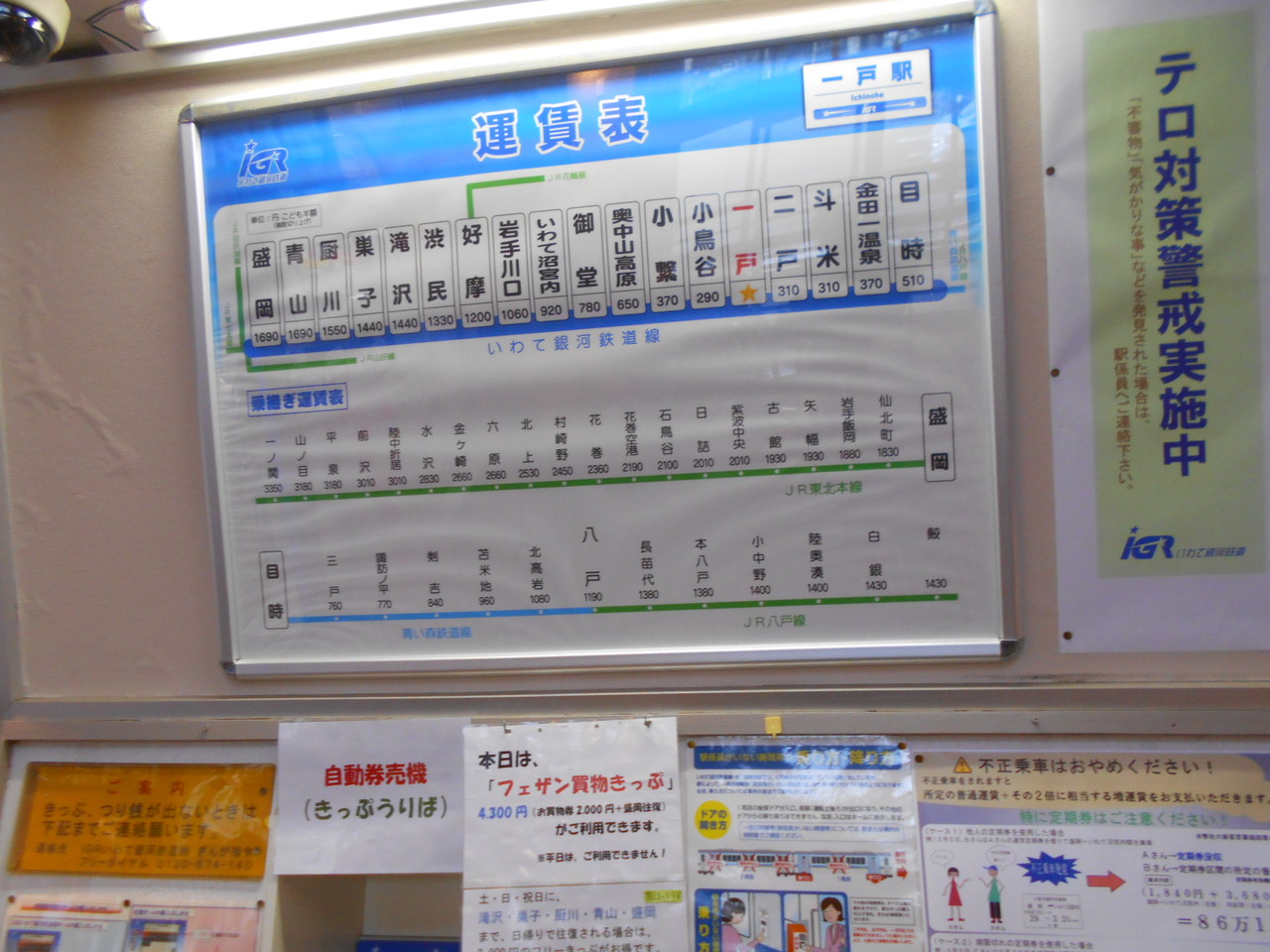 運賃表はこちら。IGRさんにはいろんな企画乗車券が用意されているので、利用目的に合わせて窓口で相談しながら購入するとお得な場合があります。
