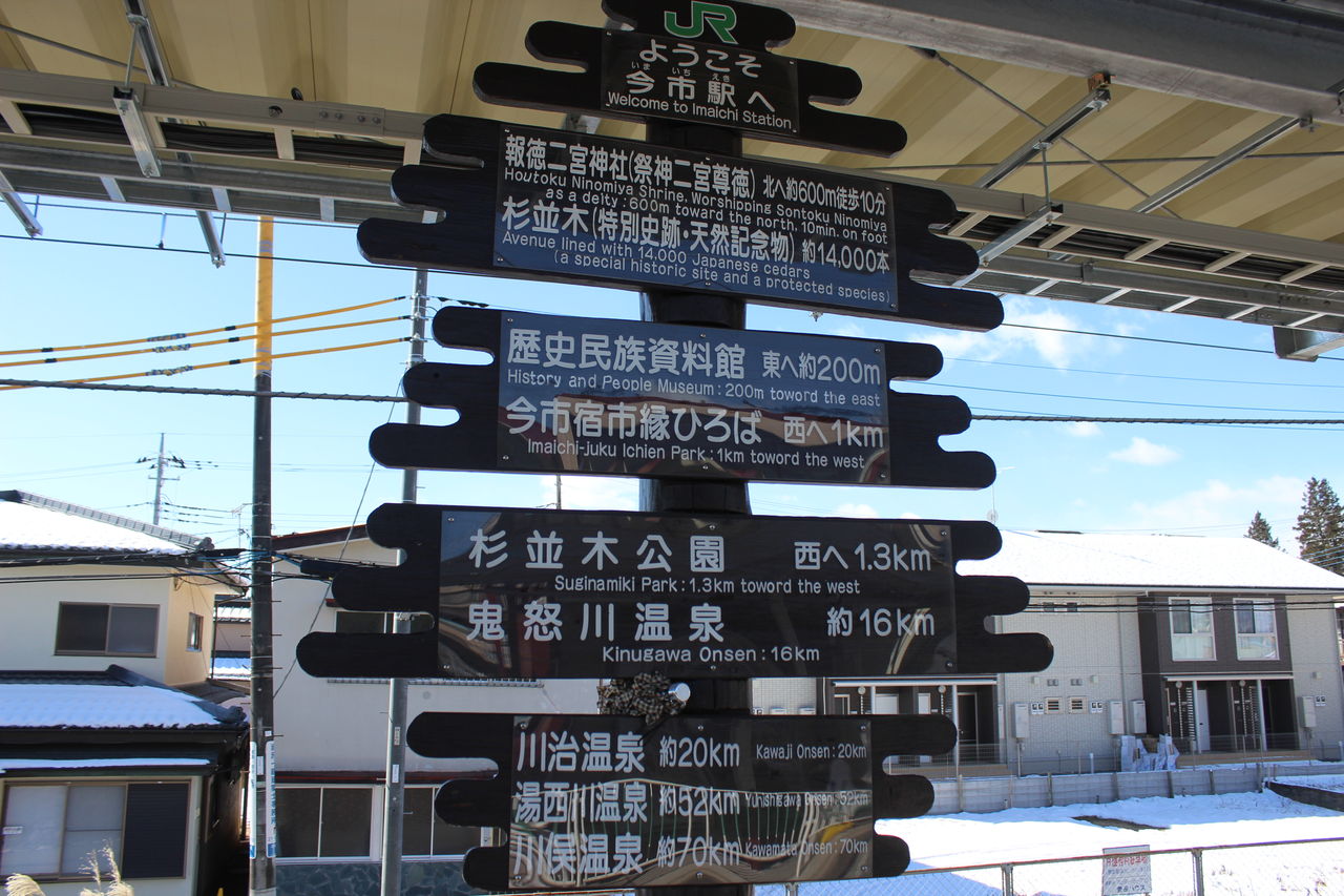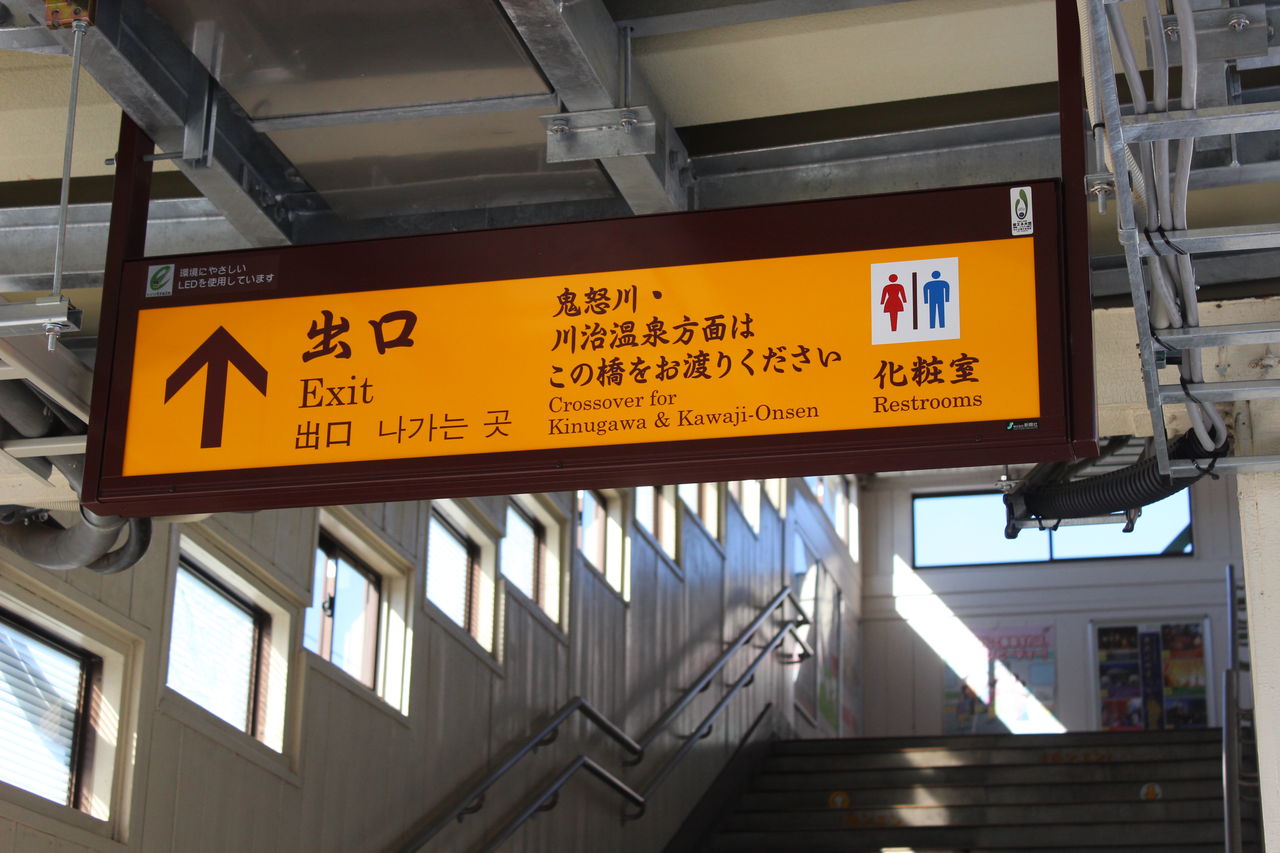 ホームに掲出されている出口の案内看板ですが、「鬼怒川・川治温泉方面はこの橋を御渡りください」とあります。調べると当駅からバスでこの方面へアクセスができるようですが、まさか下今市駅まで10分程度歩いて東武鬼怒川線に乗り換えろという事?