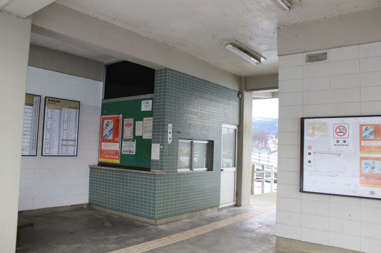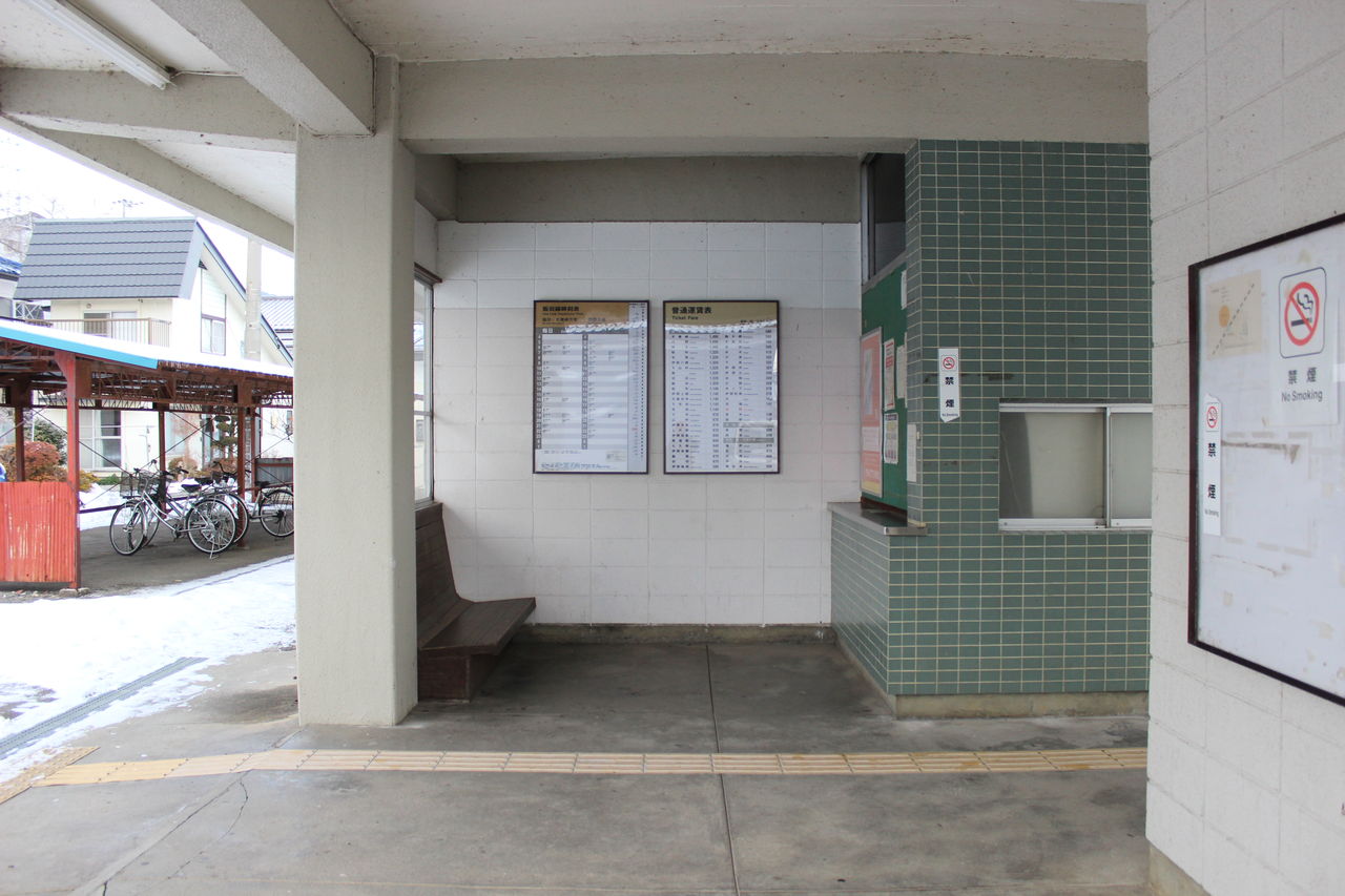 かつては運転取り扱いが行われていたついでに乗車券類の販売も行われていたようで、切符売場窓口の痕跡が残っていますが、現在はポスター類掲示板で塞がれています。