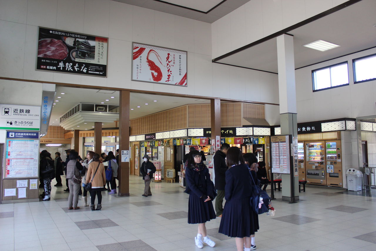 その脇には売店が軒を連ね、さらに桑名・四日市・松阪でもお馴染みの近鉄電車のきっぷ売り場も設置されています。混雑時は近鉄の制服を着用した係員がJRの自動改札機で案内をしている様子も見られます。