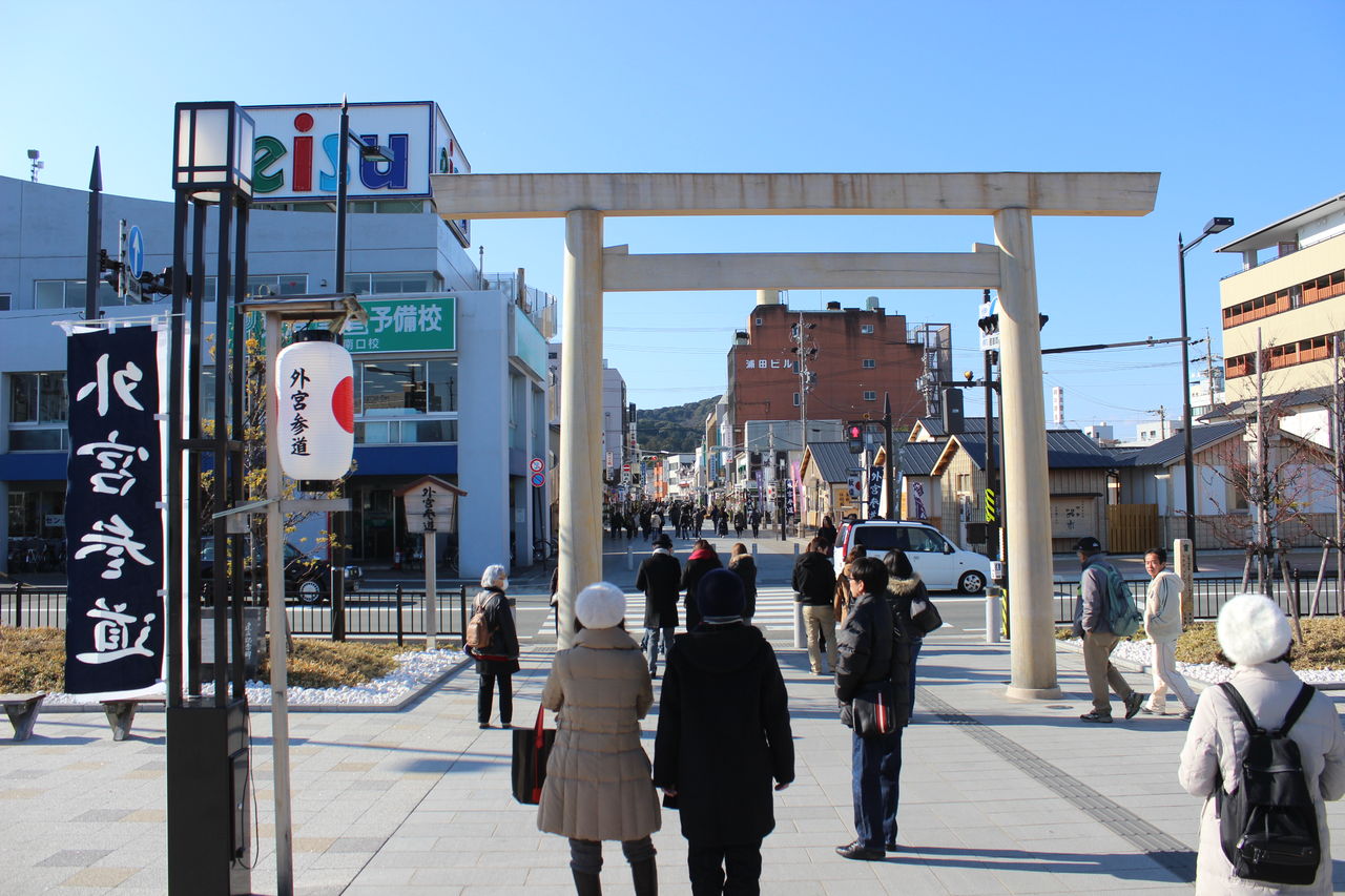 伊勢神宮の外宮への参道が延びています。徒歩およそ5分で豊受大神宮へアクセスできてとても便利です。駅前の鳥居は伊勢神宮よりヒノキを譲り受けて作成されたものとのことです。