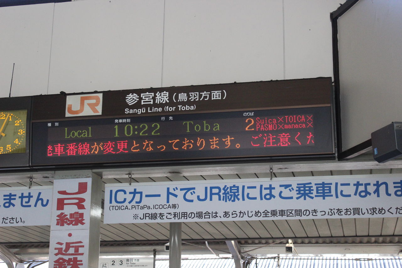 「普通 10:22 鳥羽 2」と書かれた隣に「ICカードは使えません」と併記されています。さらにこれの英文表示が…