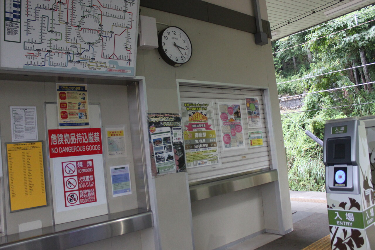出札窓口は掲示板で塞ぐ軍畑駅方式ではなく、当駅はシャッターを降ろすだけとなっていて、その気になれば出札営業可能な様子になっています。なお、自動券売機は平成30年に撤去されています。