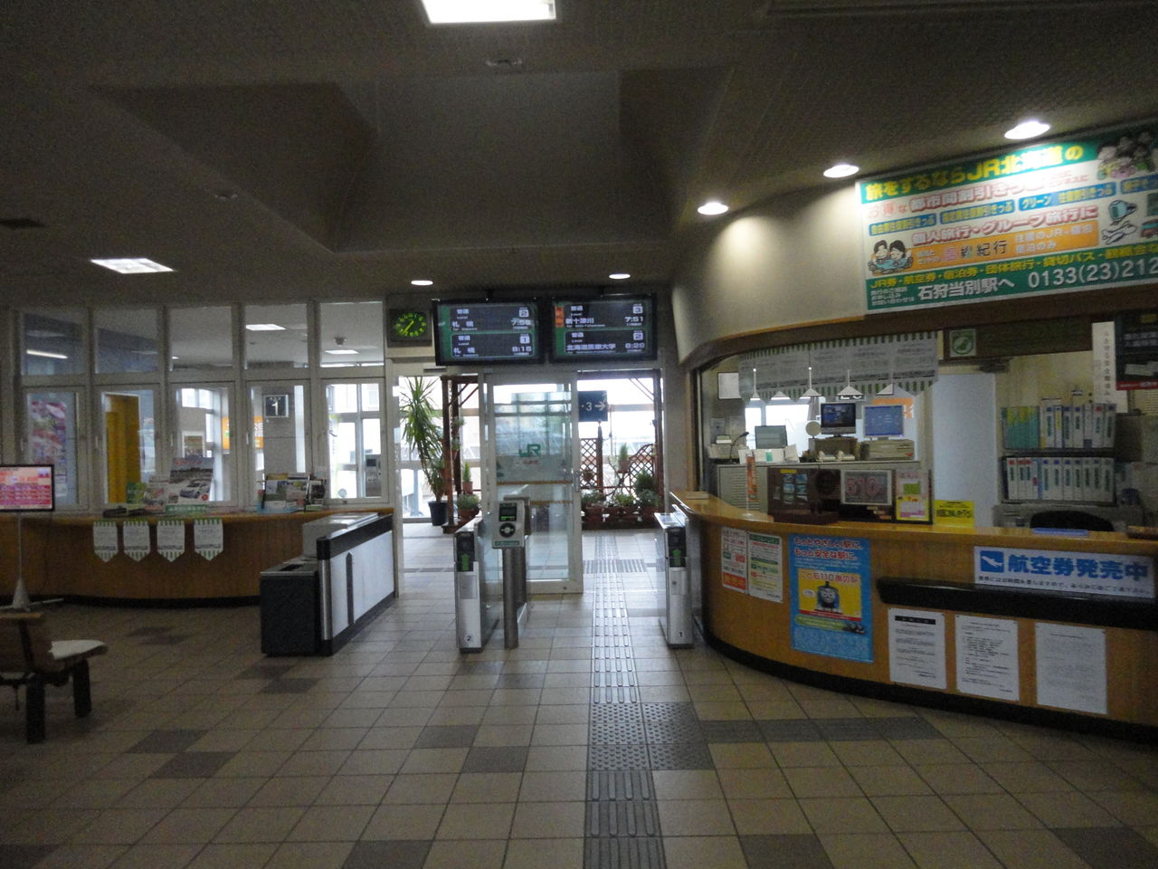 建物内部の様子です。列車待ちのための椅子が多く並べられていて居心地がよさそうな改札回りです。カウンター式の有人改札口が駅の明るさを引き立てているように感じます。