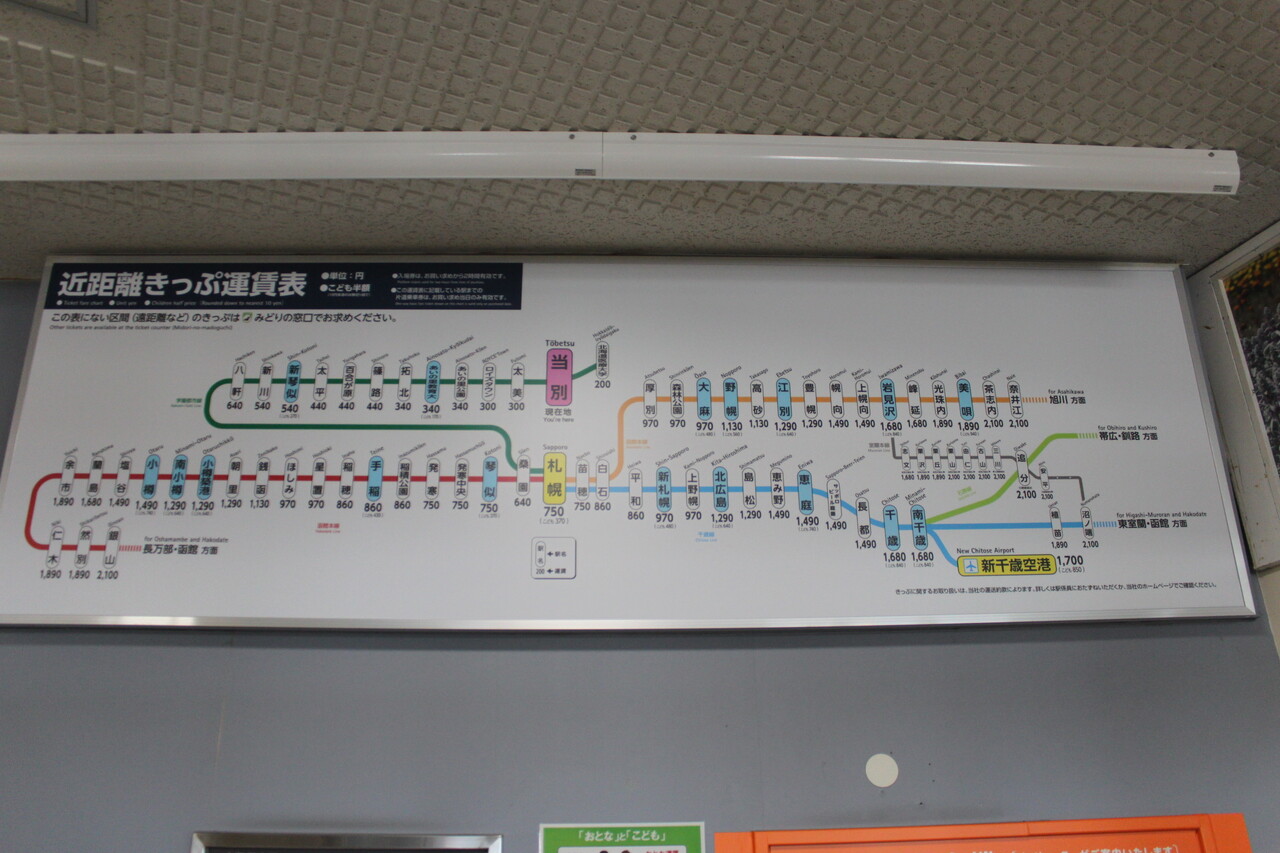令和5(2023)年撮影時点の運賃表です。札幌・苗穂・琴似~発寒までは750円、新千歳空港までは1,700円となっています。この表は当駅の近距離券売機で発売可能な2,100円区間までが表示されているため、2,420円区間である苫小牧・倶知安は表示されていません。