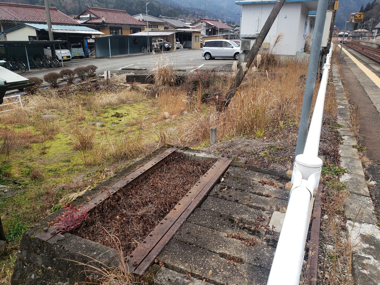 跨線橋から富山方を見た図です。駅舎から少し高台に線路とホームが設置されています。