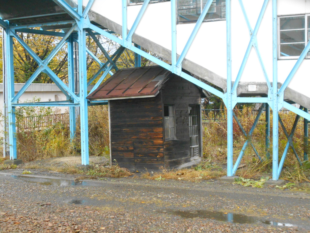 その跨線橋の下には古そうな小屋が。。。危険品庫にしては貧弱だし某JRさん(4-タ)がよくやってた日勤教育の説教部屋かなにかだったんでしょうかねぇ。