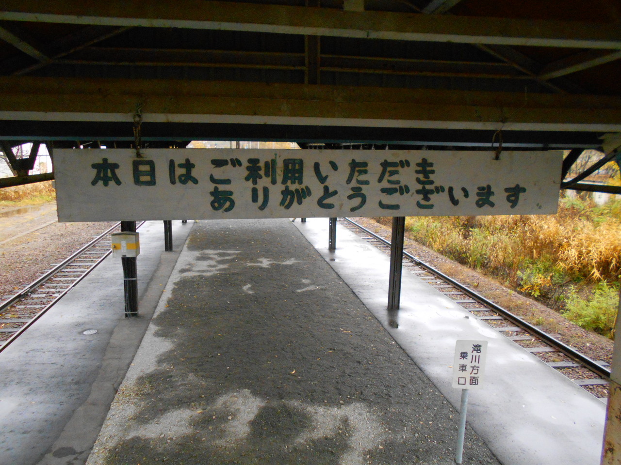 跨線橋を降りるとホームに至りますが、その直前に目に入るのが「本日はご利用いただきありがとうございます」の看板。2005年訪問時にも残存していて、ひょっとしたら駅舎が置き換わる以前から現役でぶら下っていた代物かも知れません。この看板は裏面も同じ文言になっています。
