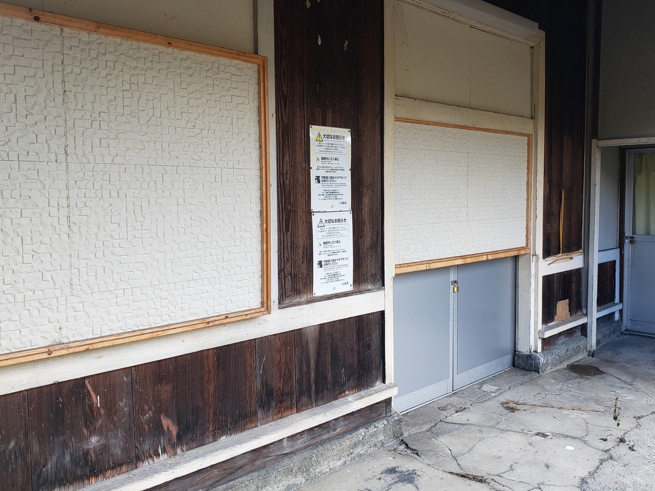 建物の線路側に回ると旧待合室部分のドアはこちらも板で塞がれています。