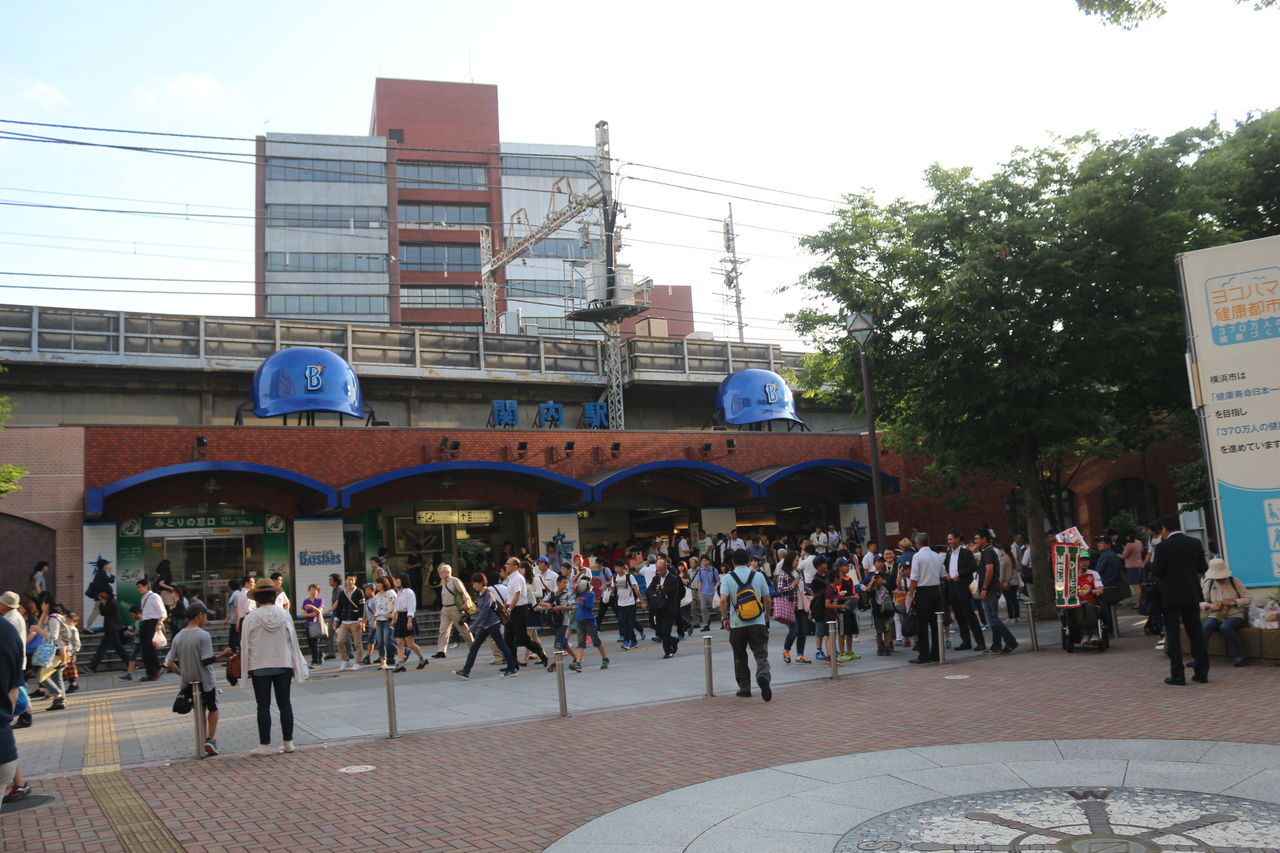 横浜スタジアム、神奈川県庁、横浜市役所などの最寄り駅です。野球開催日と朝の通勤時間帯は混雑を極める駅でもあります。横浜スタジアムに近い南口には2011年からプロ野球・横浜DeNAベイスターズのヘルメットを模した装飾が施されていて、プロ野球がある駅を演出しています。同じJR東日本の駅ではプロ野球・東北楽天ゴールデンイーグルスの本拠地最寄りである宮城野原駅にも同様の装飾が施されています。