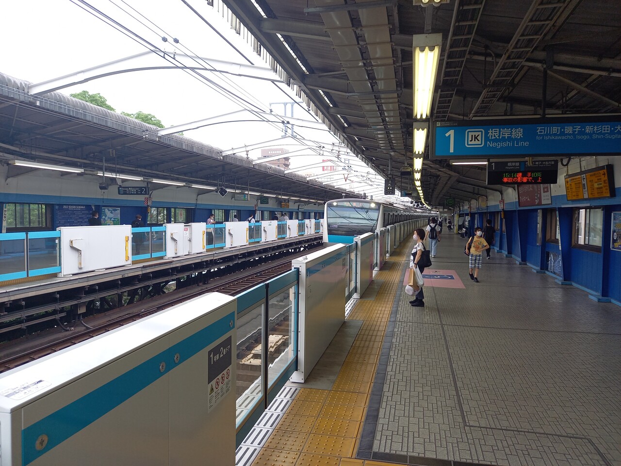 ホームの石川町方先端はホームドア設置のためかなり狭くなっています。