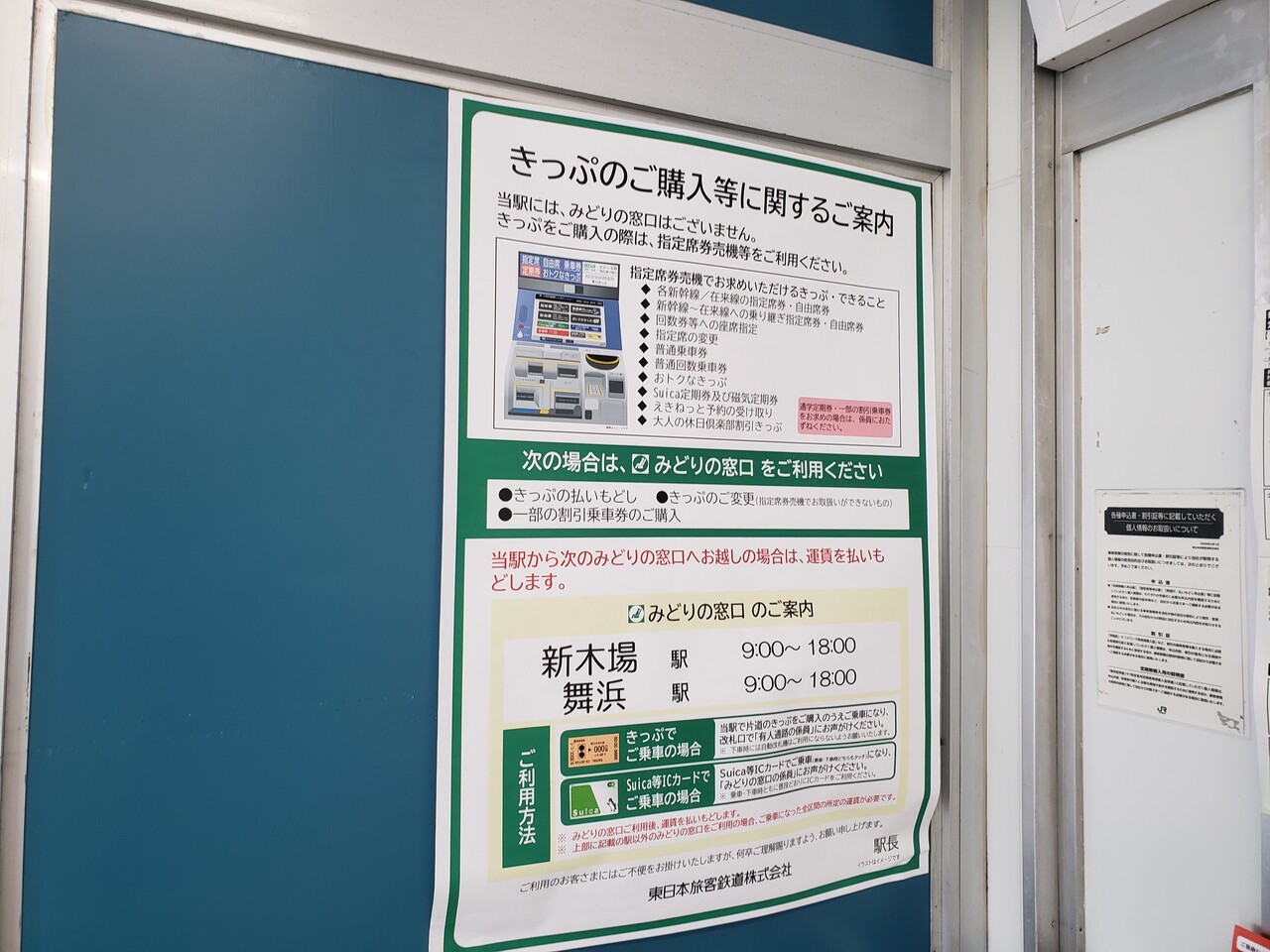 当駅のみどりの窓口は2014年春に廃止され、代替として指定席券売機が設置されていて、その利用指南のためのポスターが掲示されています。券売機で対応しきれない場合は両隣駅のみどりの窓口を利用するよう案内されています。