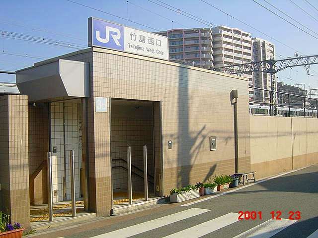 こちらは線路の脇の公道にいきなり面している南口で、西淀川区竹島側になっています。良く見ると駅名表示に「加島」の文字は見当たらず、まるで竹島エリアの皆さんに正式名称を通達するのが申し訳ないかのごとく「竹島西口 Takeshima West Gate」とあります。これは駅設置時から現在に至るまで変わっていないようです、