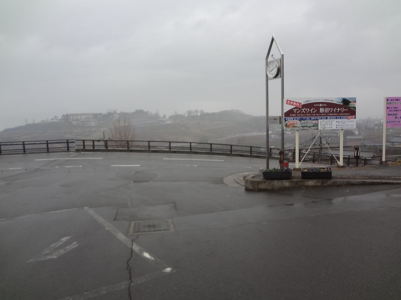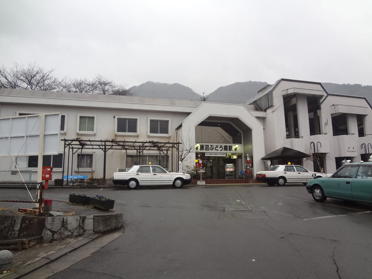 当駅は笹子峠と甲府盆地の高低差を避けるために少々蛇行して線路が敷設されていて、旧勝沼町の中心地から離れています。よって駅前の様子はご覧のとおり。勝沼の風景が一望できるのは結構ですが、町の中心部へ用事がある人はタクシーなどに頼る必要が出てきます。