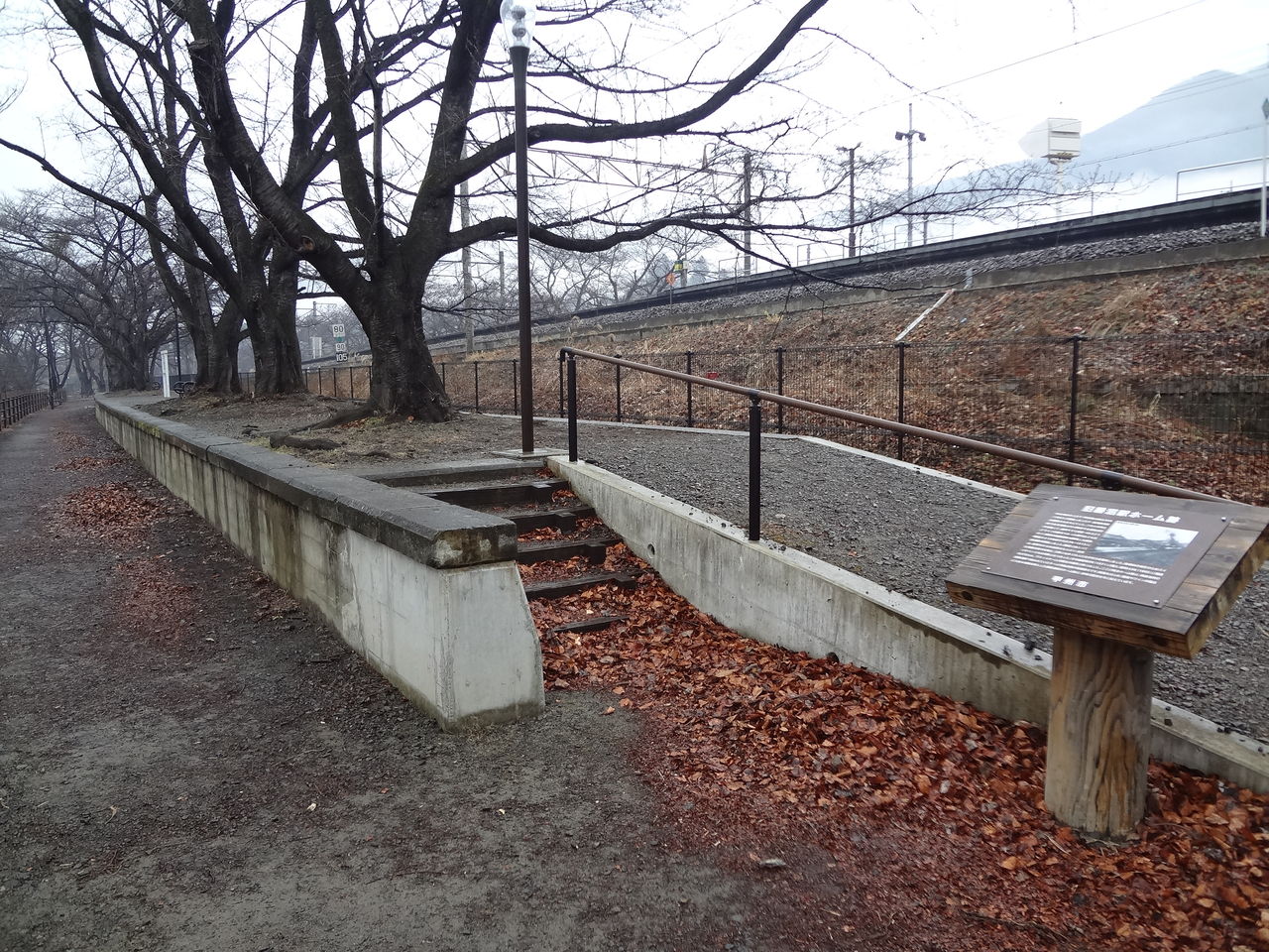 改札内には歴史が箇条書きされた看板があります。その歴史は当駅からすぐの公園に行くと実感できます。