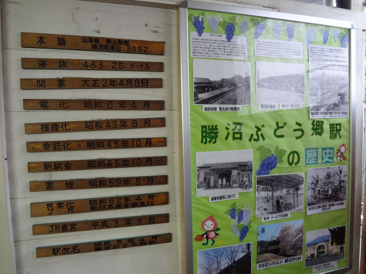 勾配途中にあるぶどう畑に面した駅で、駅名は1993(平成5)年に「勝沼」から現在の「勝沼ぶどう郷」へ変更してぶどうを前面に押し出しています。「井川さくら」「さくらんぼ東根」のような名物と地名を混ぜた駅名の先鞭的な存在でもあります。