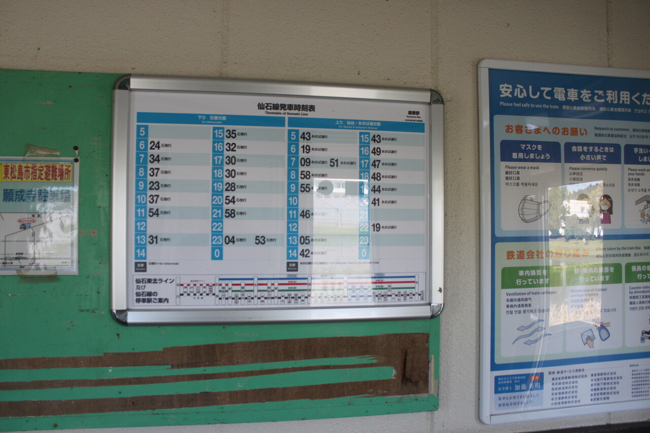 当駅の運賃表です。宮城野原駅~仙台駅・あおば通駅までは680円、石巻駅までは240円となっています。運賃表はありますが自動券売機はありません。Suicaへのチャージも駅設備では行えません。ここから最も近いチャージ対応のコンビニは陸前小野駅前のファミマとなります(当駅近隣にあったコンビニは廃業した模様です)。