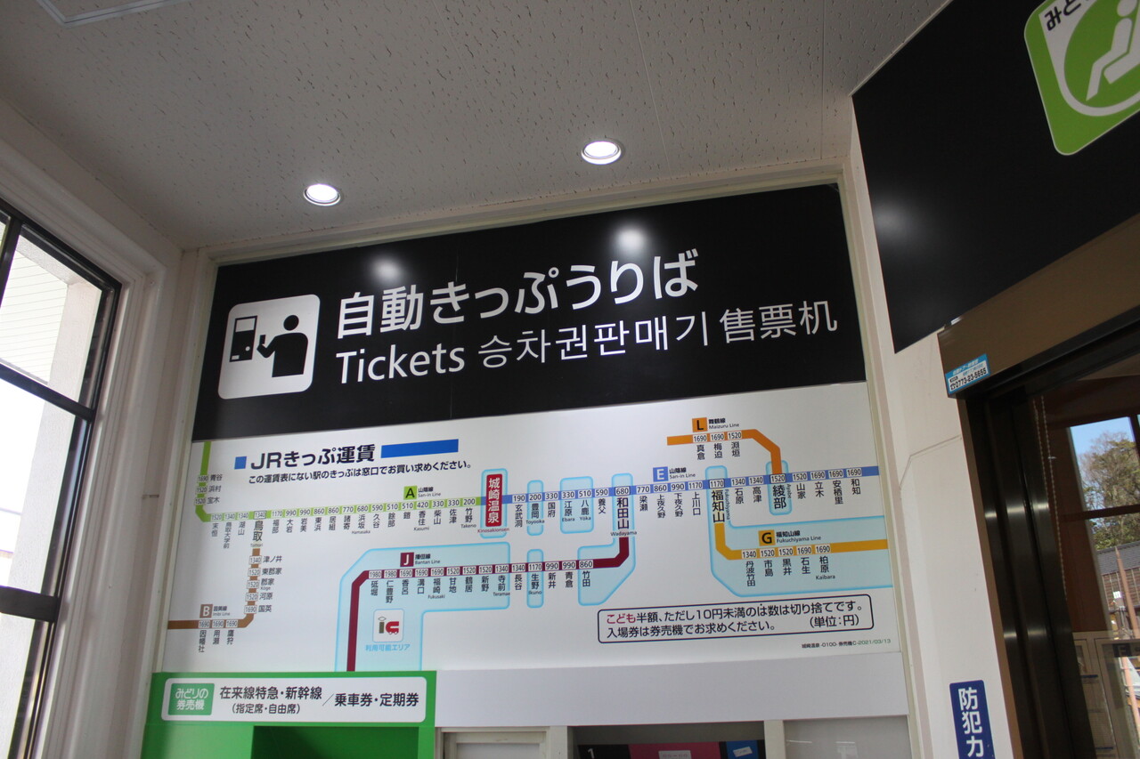 当駅からの運賃表です。図にある薄い青で囲まれた駅は交通系ICカードが利用できる駅です。みどりの券売機が備わっているため、駅窓口閉鎖時間であっても指定席の発でも対応が可能です。