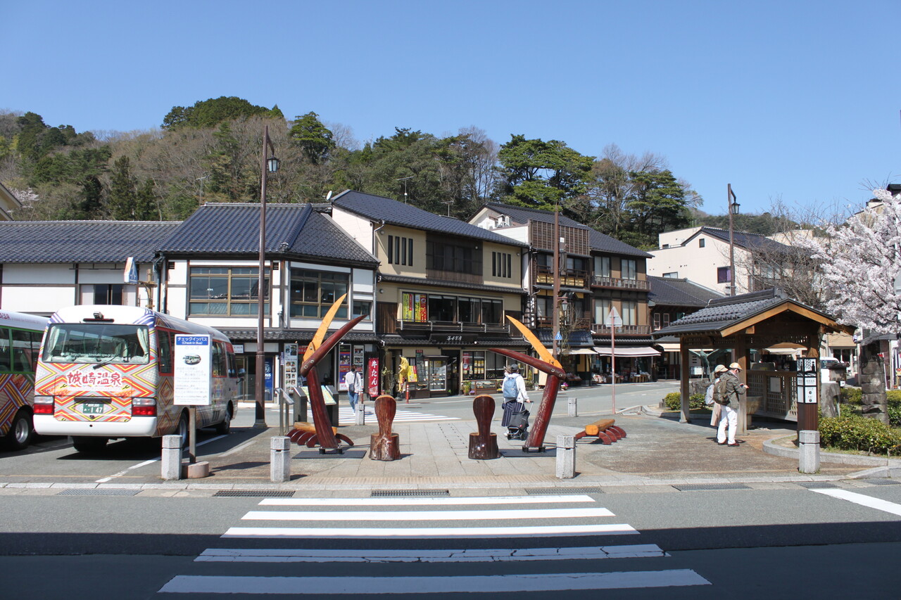 大正15(1926)年竣工の2台目駅舎が改築され大切に使われている駅です。駅前広場は温泉街の雰囲気が色濃く、また広場には記念撮影用のカニのハサミのオブジェが置いてあります。