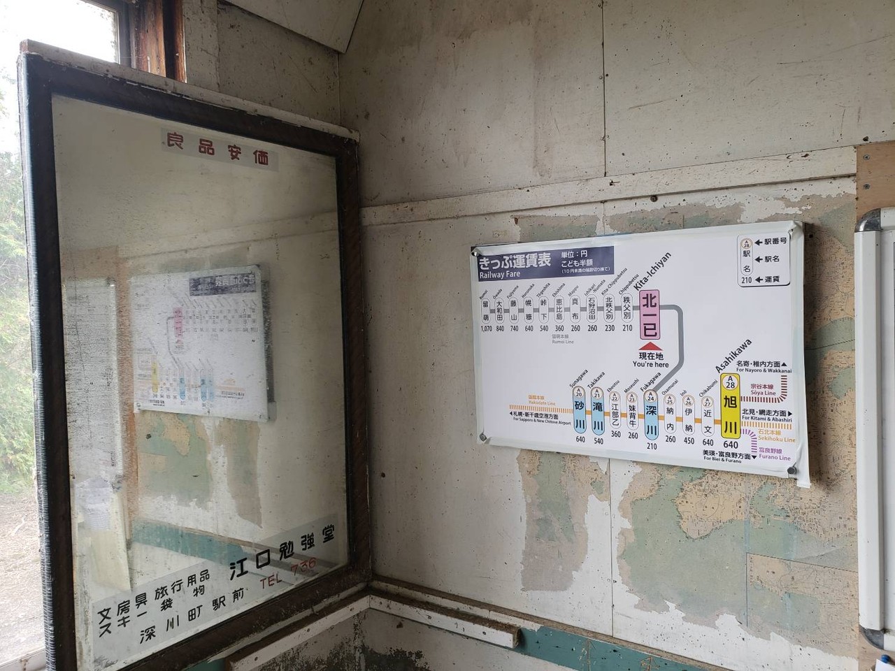 駅舎内には鏡が設けられています。「良 品 安 価」の文字が上部に輝いていて、その下には鏡を提供したスポンサーが書かれています。「江口勉強堂」と書かれていますが、さすがに現存はしていなさそうです。「文房具 旅行用品 スキー 袋 物」「深川町 駅前 TEL 736」とあります。736は恐らく当時の電話番号なのでしょう。市外局番も市内局番もなく、いきなり3桁ってすごいなぁ。