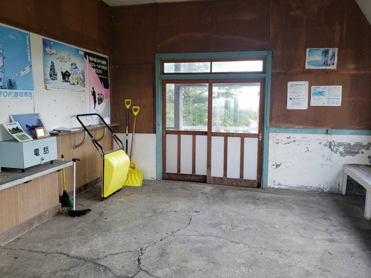 建物内は椅子があり、かつて有人駅であった名残りで荷物取扱窓口台と出札窓口の台が残っています。