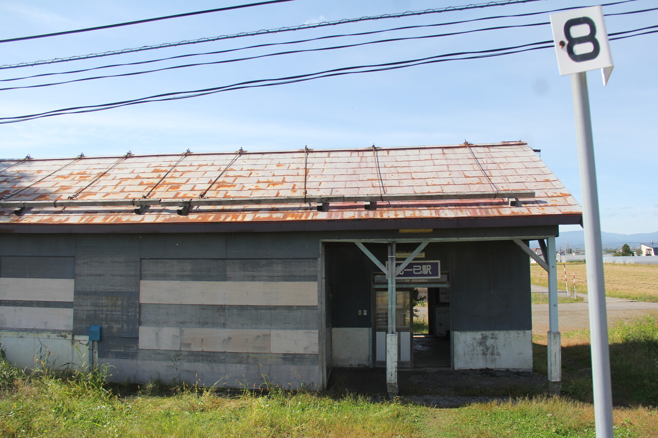 駅舎建物は後段掲載の2003年当時の建物と同じですが、老朽化対策でグレーの板で補強されています。本来であれば近代的な待合室へ建て替えたいところなのでしょうけど、JR北海道が公表している当駅の一日平均利用者数は留萌線内では最も少ない1.2人。そんな利用者数が少ない「やばい駅」をJR北海道が自己資金で建て替えるわけもなく、(北秩父別駅のように)地元自治体による負担も期待できない、、、かといって待合室が無いのは厳冬期対策として問題がある・・・それなら「建て替えるよりは割安な板貼り補強で凌いでしまえ」ということなのでしょう。