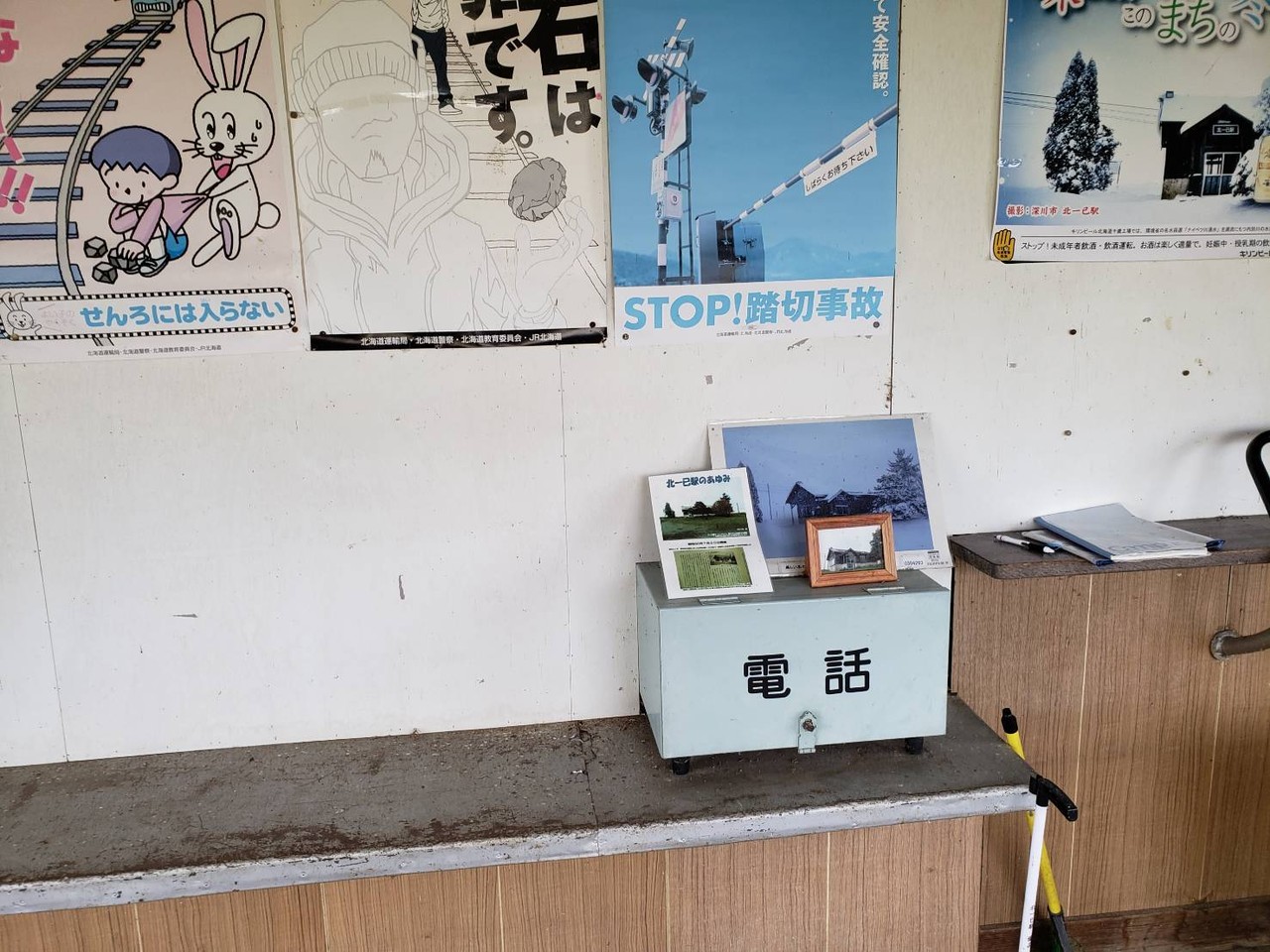 手回し式の黒電話が備わっていて、現役で使えるようです。回すと管理駅である深川駅につながるんでしょうかねぇ。