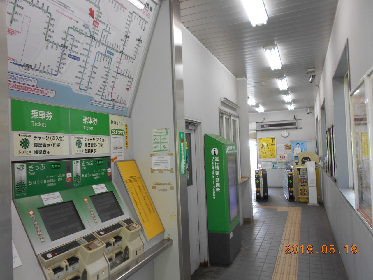 小さな駅舎を反映して、中の様子もかなり小ぢんまりとしています。自動改札機は2通路分で、有人通路を含めても3通路分のみのコンパクト設計。斜め設置となっています。