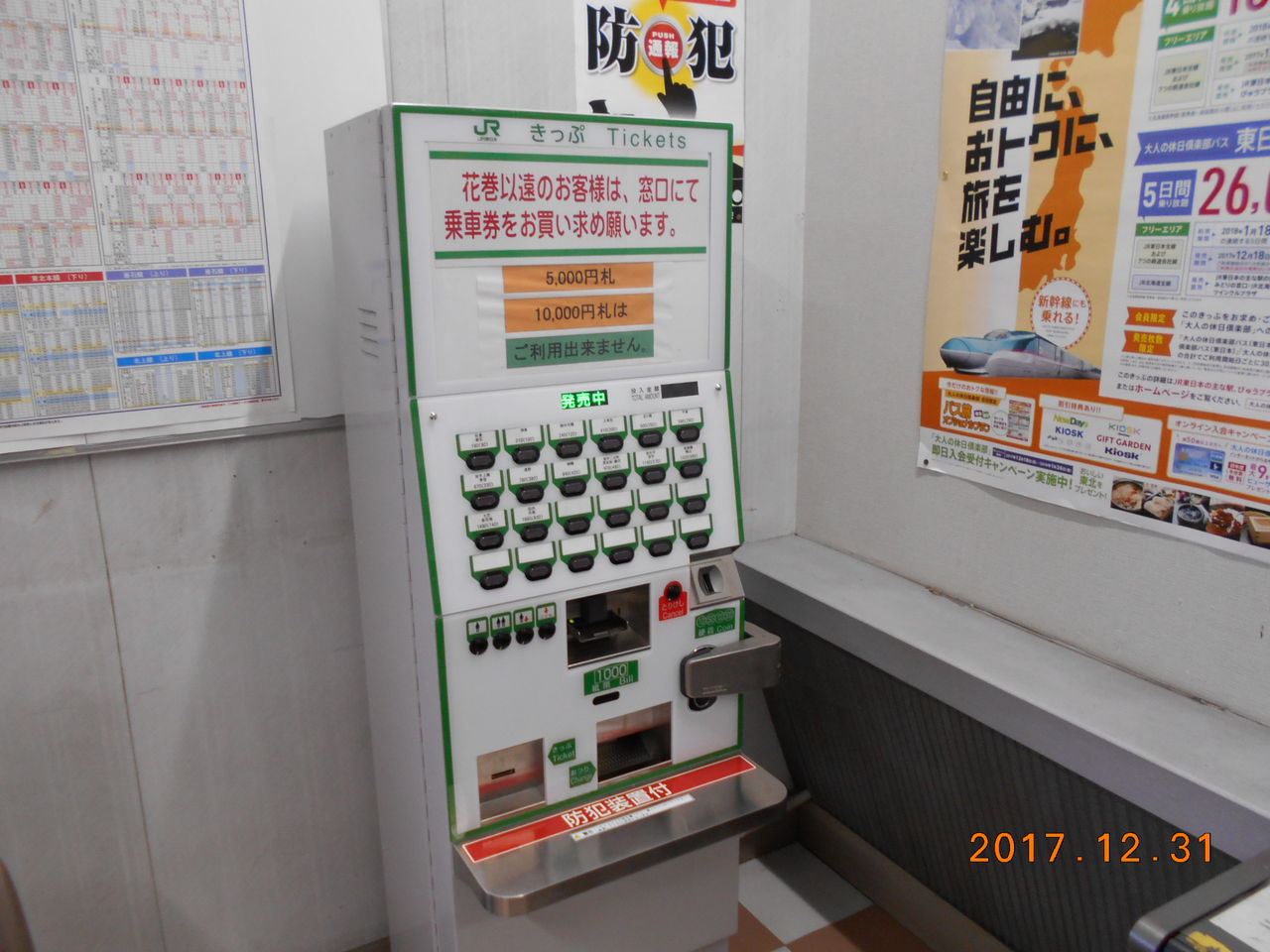 当駅には自動券売機も完備されています。この券売機は窓口営業時間外でも稼動しているようです。券売機には「花巻駅以遠のお客様は窓口にて」と表示されていますが、窓口閉鎖時間帯の場合は乗換駅まで買っておいて降車時に乗り越し精算をすればいいという案内はされていませんね。