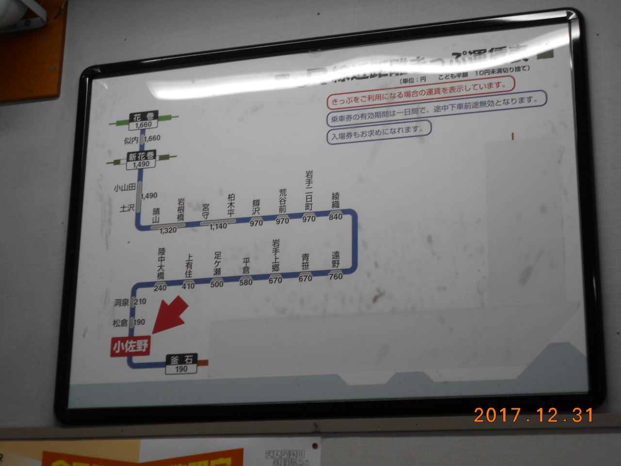 当駅掲示の運賃表です。一見すると釜石線の特徴をよく示した図示になっているように感じますが、釜石線が右手へ大きく迂回している区間は足ヶ瀬駅~洞泉駅間ぐらいなのでちょっと大袈裟かな。。。
