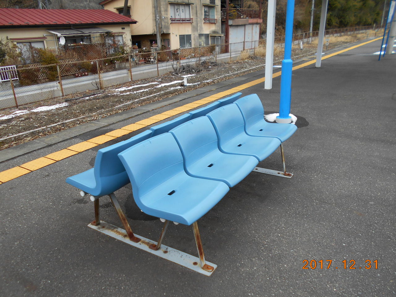 ホーム上にある椅子は野球場のスタンドに設置されていることが多いタイプです。
