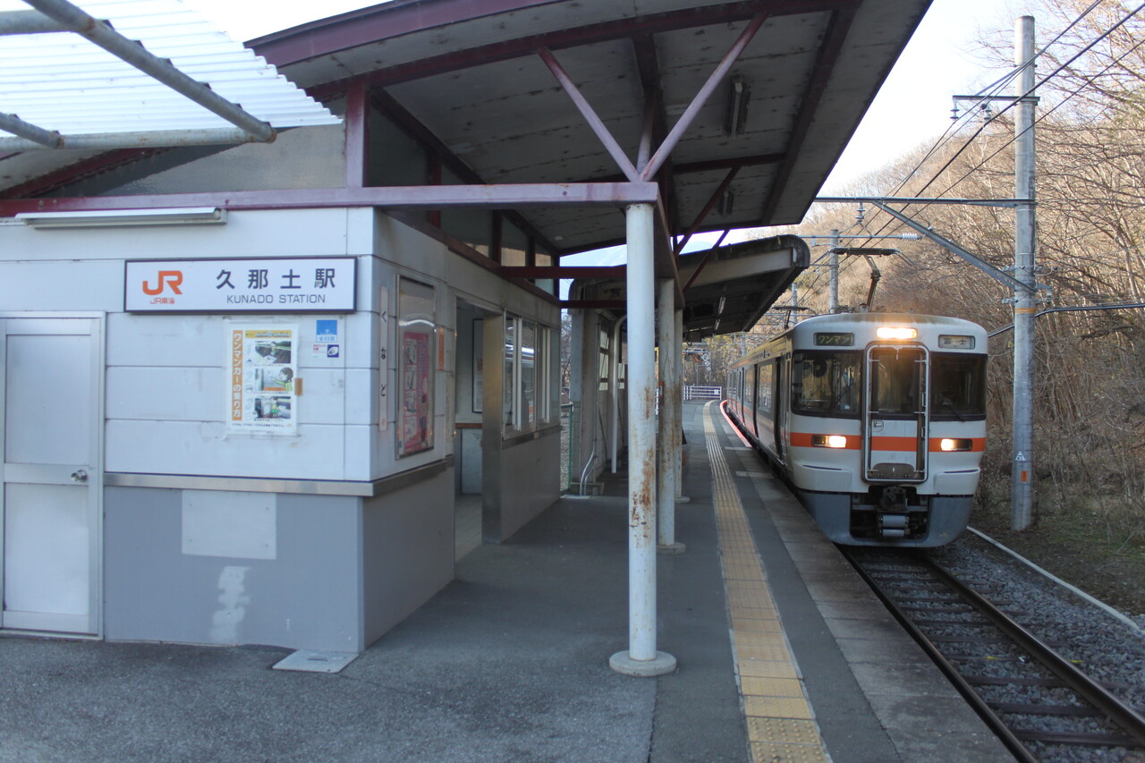 駅の外の様子です。久那土は市ノ瀬とも岩間とも山に隔てられていて、谷に設けられた集落が左右に広がるようになっています。ここが村として独立していたのも納得の立地です。