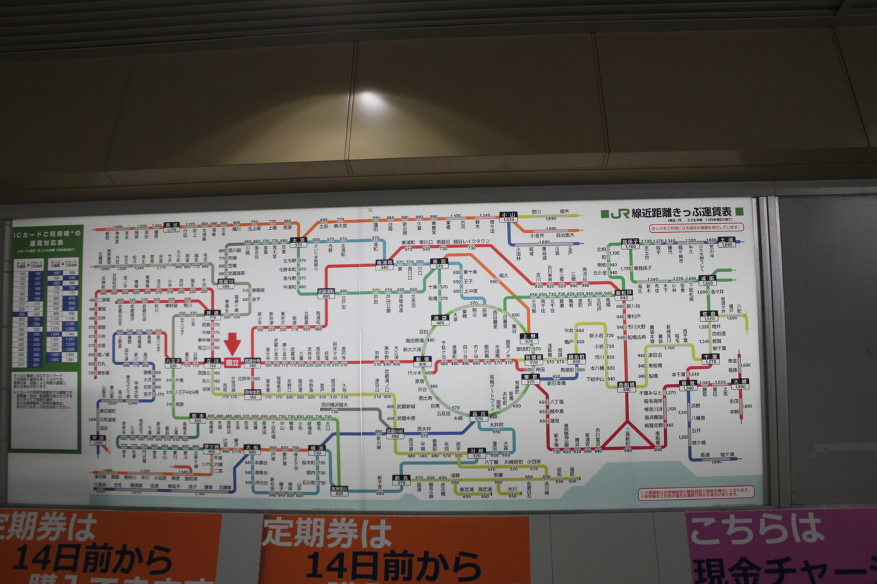 運賃表です。東京駅までは570円、新宿駅までは400円、当駅からはいずれも乗り換えなしでアクセスができます。