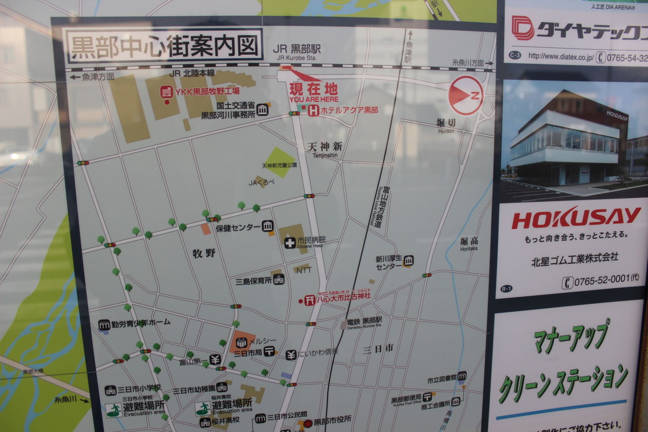 あいの風とやま鉄道(旧JR)の黒部駅は市街地中心部からやや離れた位置にあります。駅の近くに富山地方鉄道とあいの風とやま鉄道(旧JR)の立体交差がありますが、地鉄と当駅に隣接しての駅は無く、約1キロ程度離れた場所に「電鉄黒部駅」があります。北陸新幹線の黒部宇奈月温泉駅とは離れていて、皮肉なことに1キロ先の電鉄黒部駅から富山地鉄電車に乗って新黒部駅での乗り換えとなります。