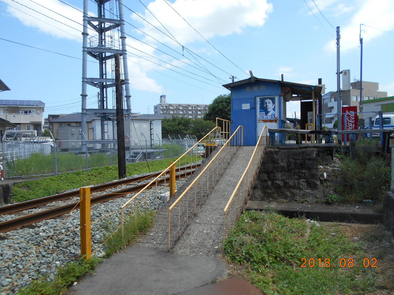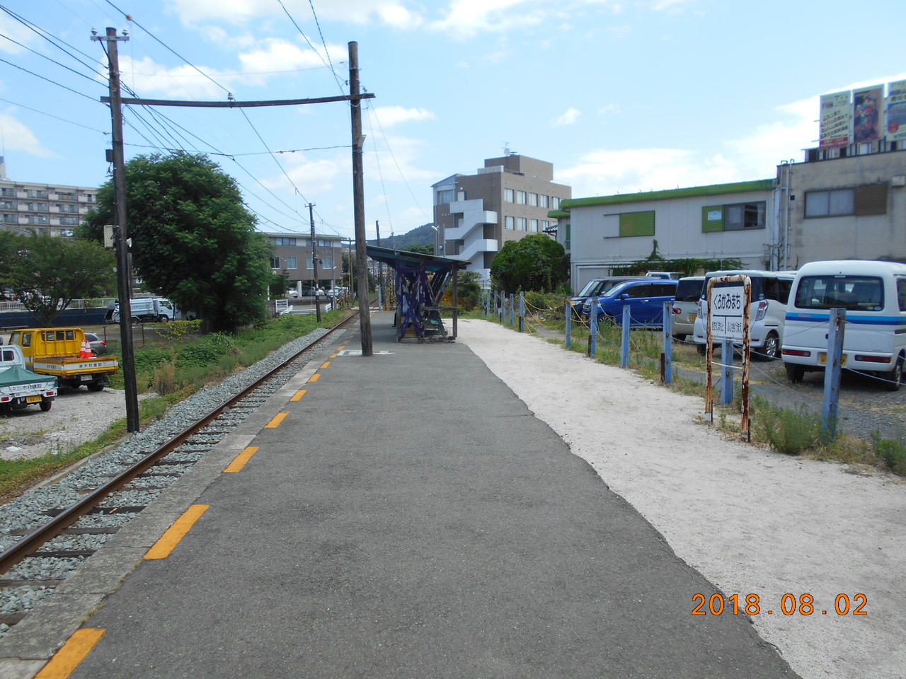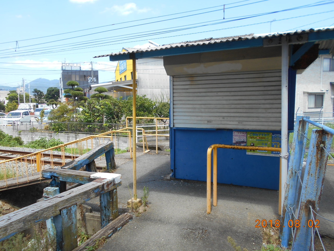 熊本電鉄の駅の中では珍しい部類に入る、きっぷ売り場の建物がある駅です。スロープ状の通路を進めば手軽に駅構内へ出入りが可能なバリアフリーな駅でもあります。この駅にも某政治家のポスターが貼られていますね。