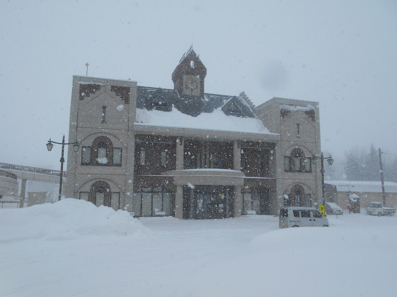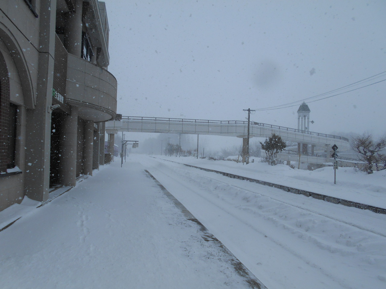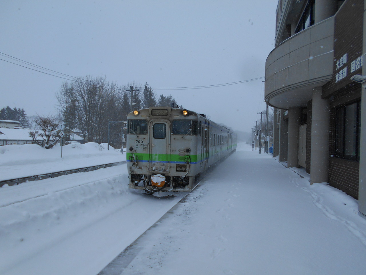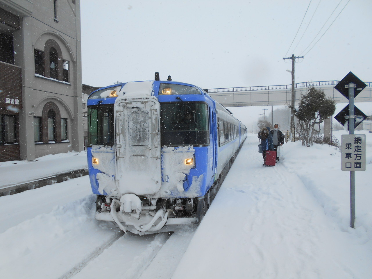 吹雪の中の女満別駅舎です。立派な図書館建物の1階の一部が駅待合室として開放されています。