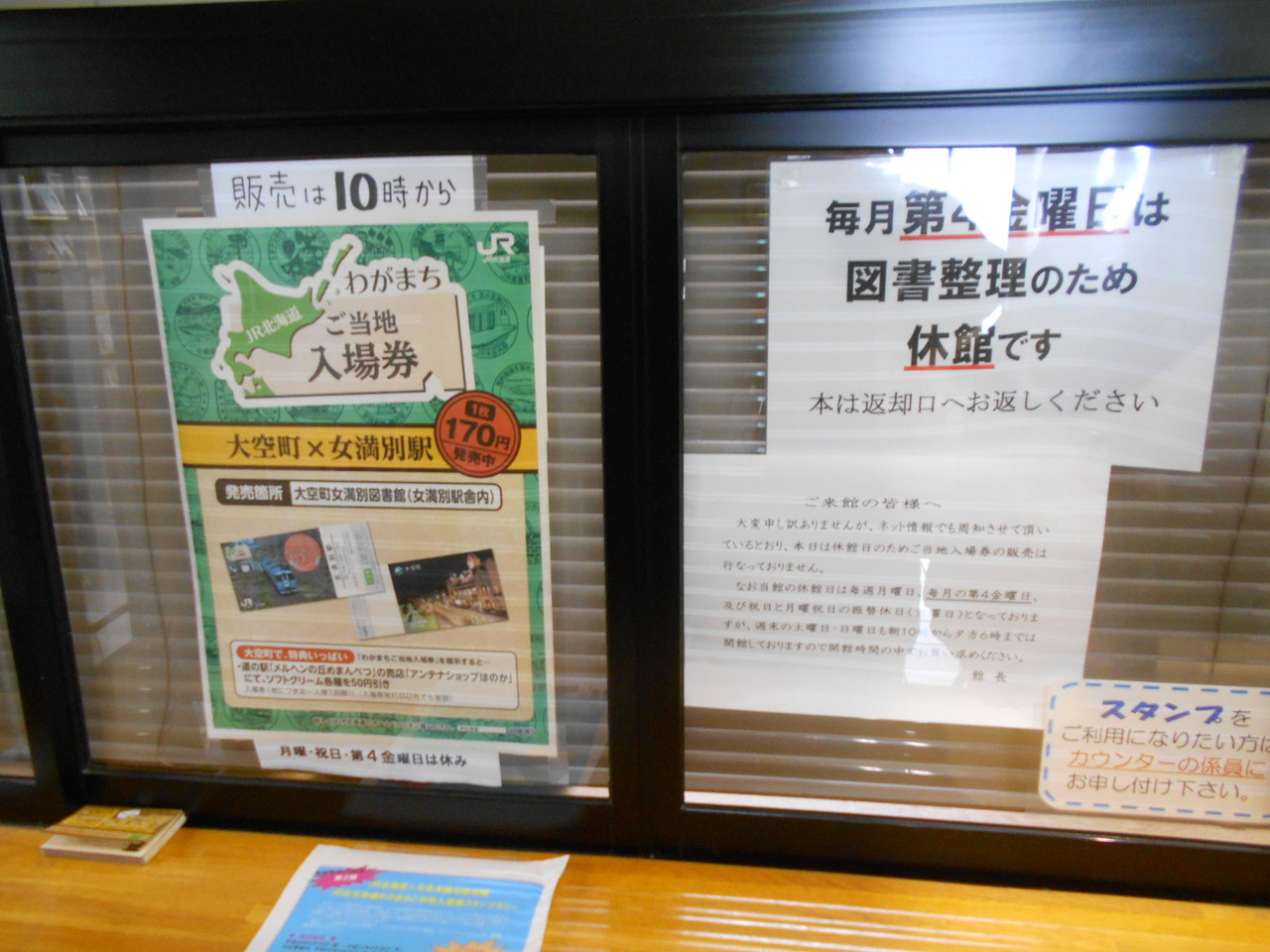 きっぷ売り場のように見える窓口は図書館の受付で、JR北海道わがまちご当地入場券の販売はここで行われていたのですが、、、