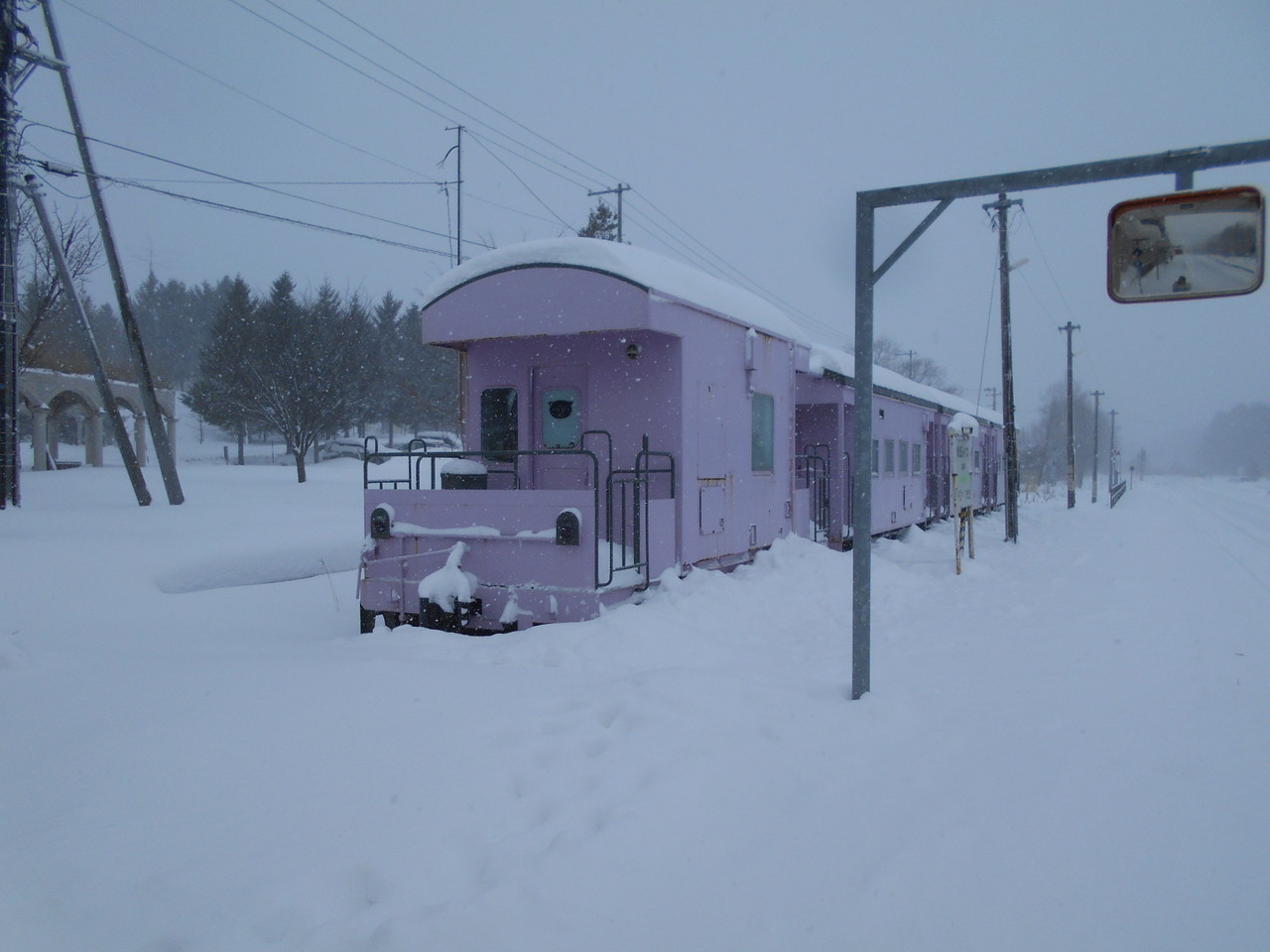 当駅構内に鎮座している貨物列車の車掌車両はなぜかピンク色に塗られています。