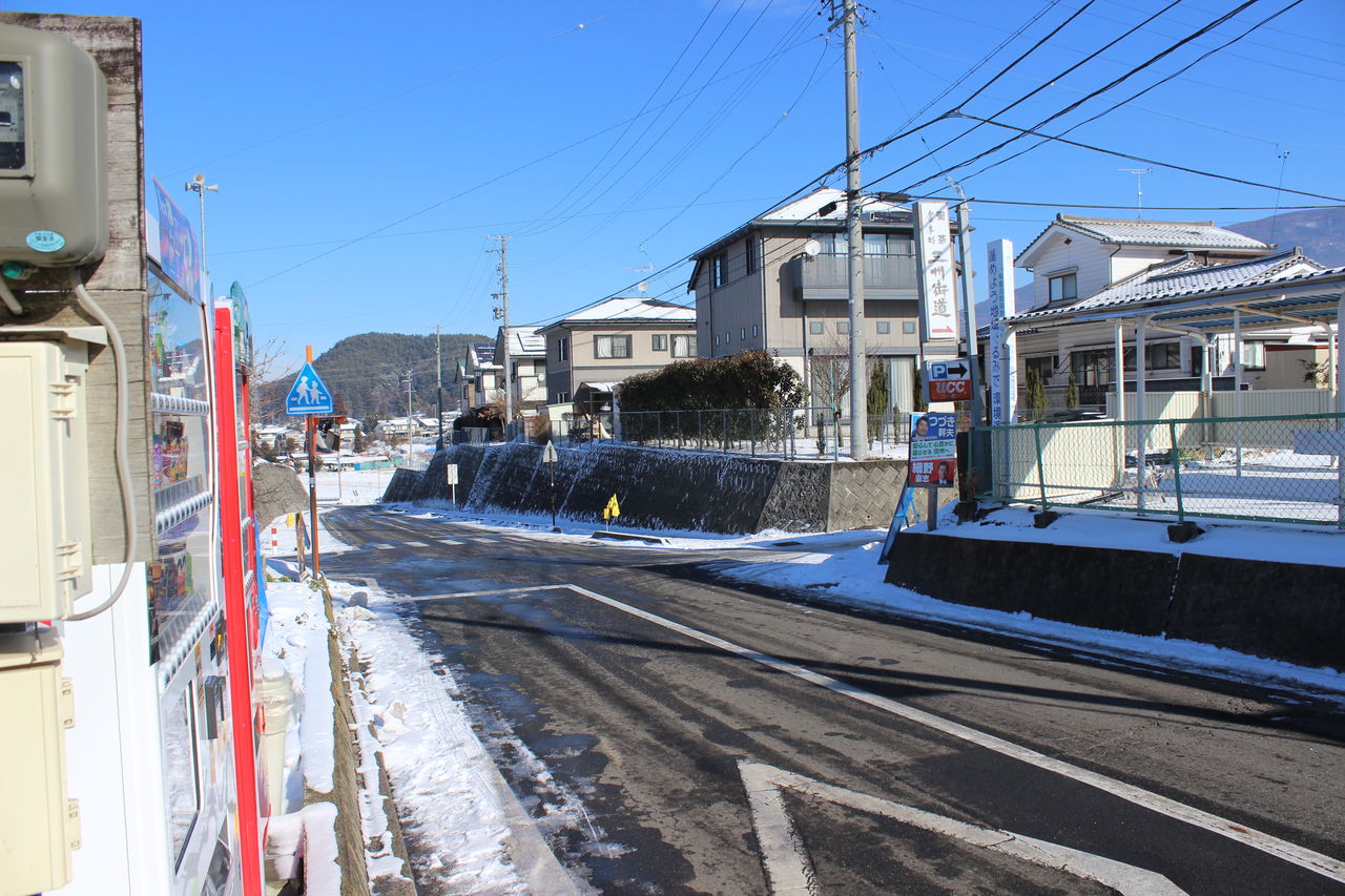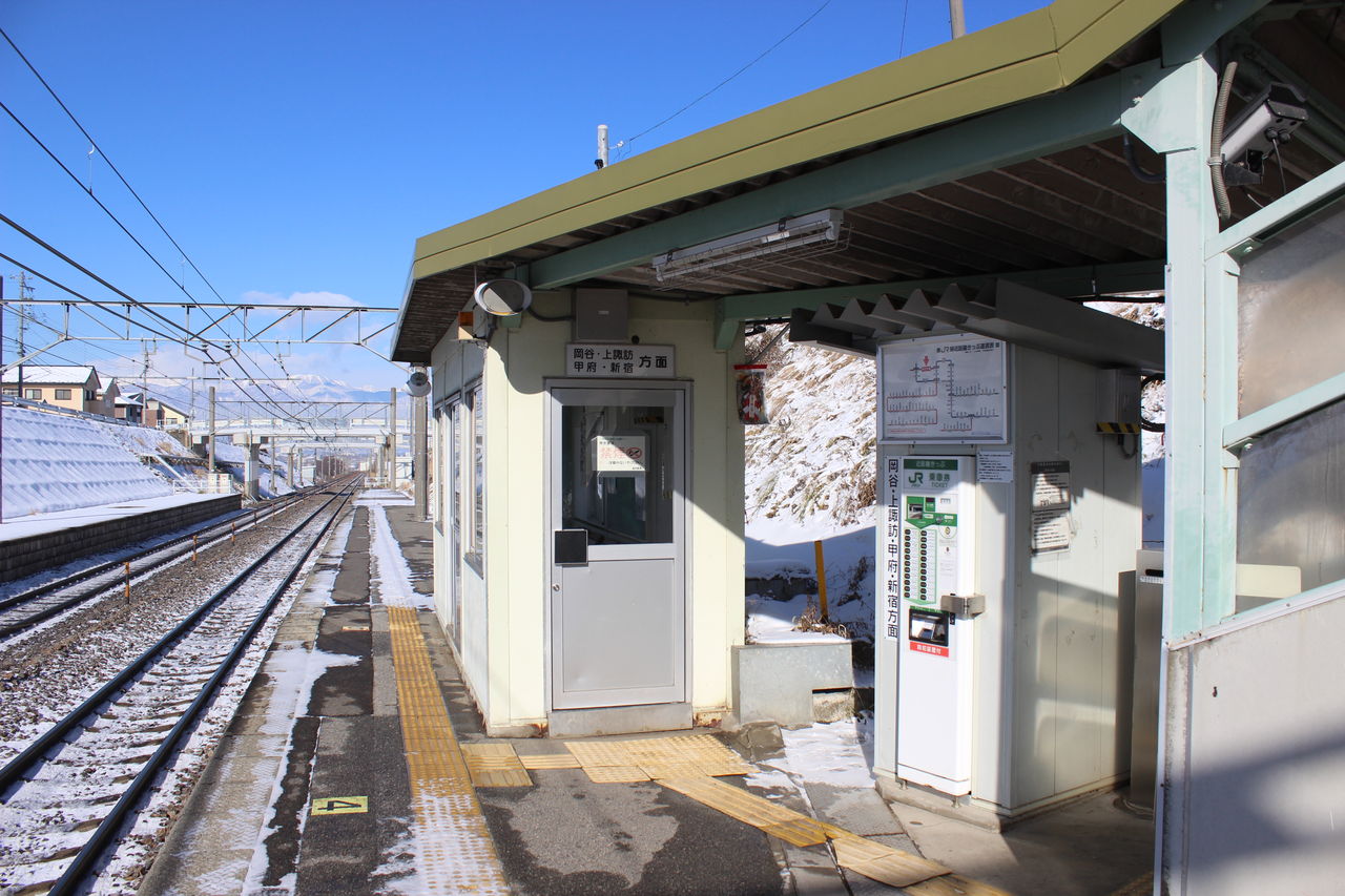 ダイドードリンコ社とコカコーラ社の自販機の脇にある階段は岡谷・上諏訪・甲府・新宿方面の上り列車が発着するホームへの階段です。当駅は上下線で出入り口が分離しています。いわゆる「駅舎」は無く、上下線ホームにそれぞれ待合室があります。
