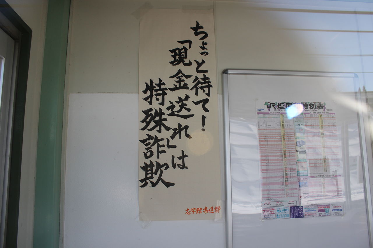 近隣の私立高校生が書きあげた振り込め詐欺対策の標語が掲示されています。余談ですが当駅とは無関係の当ブログ筆者元カノの親が騙されて300万円を振り込んだのを思い出しました。。。。皆さんもこの手の詐欺事案にはじゅうぶん気を付けましょう。