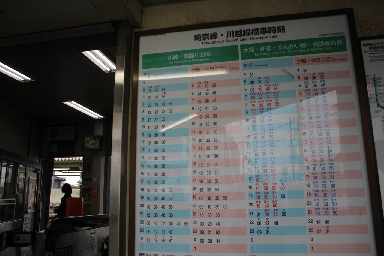 時刻表です。当駅は車両基地最寄り駅となっていて、早朝に上り1本(5時台の新宿行各停)、下り2本(5時台と6時台に八王子行)の当駅始発列車が設定されています。八王子行は当駅~川越間ではレアな電車4両での運用となっています。