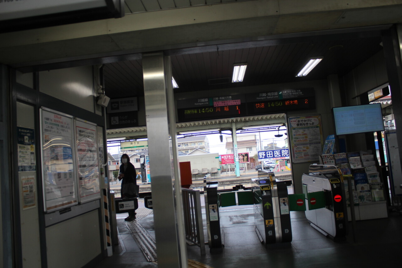 建物内の改札口です。当駅は改札などを担う営業部門は株式会社JR東日本ステーションサービスへ業務を委託していて同社の係員が対応します。運転関係社員も配置されており川越駅配下の社員が配置されていて川越線全体の信号扱いを担当しているんだそうです。