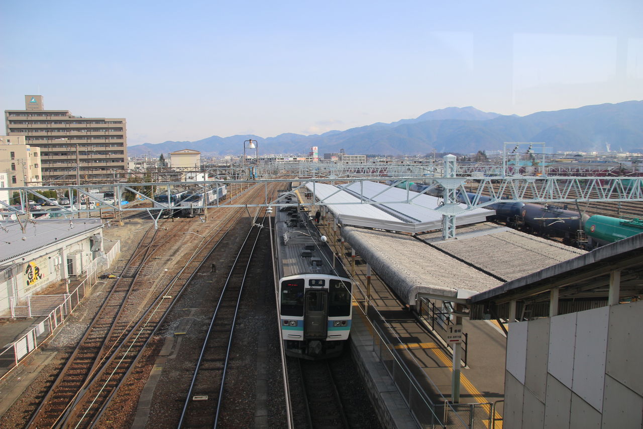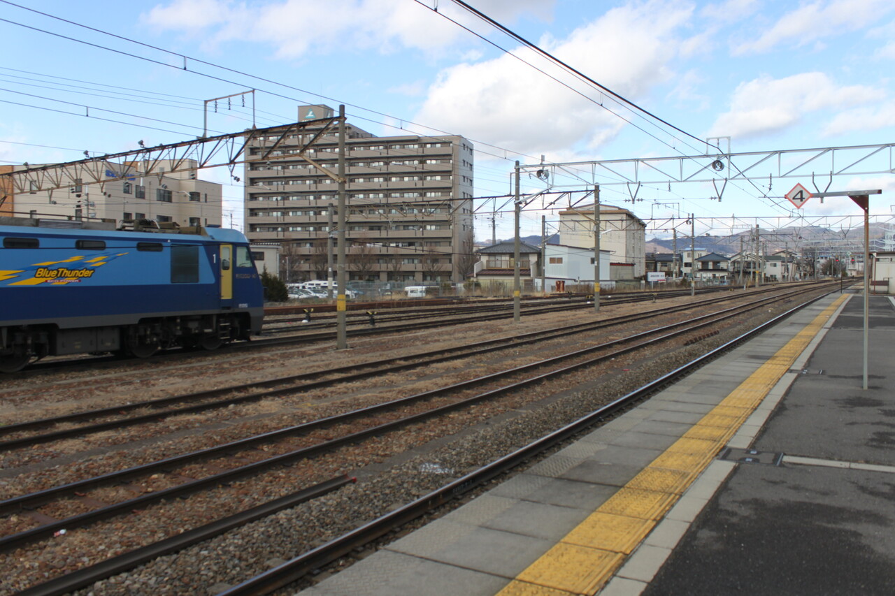 跨線橋から松本駅方向を見た図です。駅構内は側線が多数並んでいます。そこは貨物列車向けの機関車が行き来していて、早朝から撮り鉄さんがホームに屯している様子が見られます。
