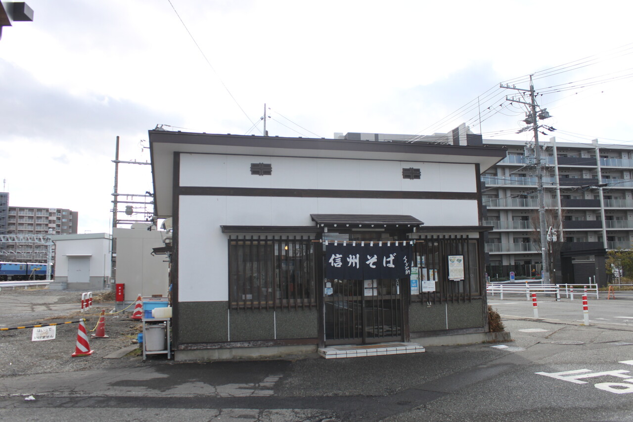 駅前広場には「信州そば」の暖簾が下がるお蕎麦屋さんが出店しています。松本駅で駅弁販売を営んでおられる事業者さんが松本駅前・村井駅前と当駅前でお蕎麦屋さんを朝7時台から元日以外毎日営業されておられます。