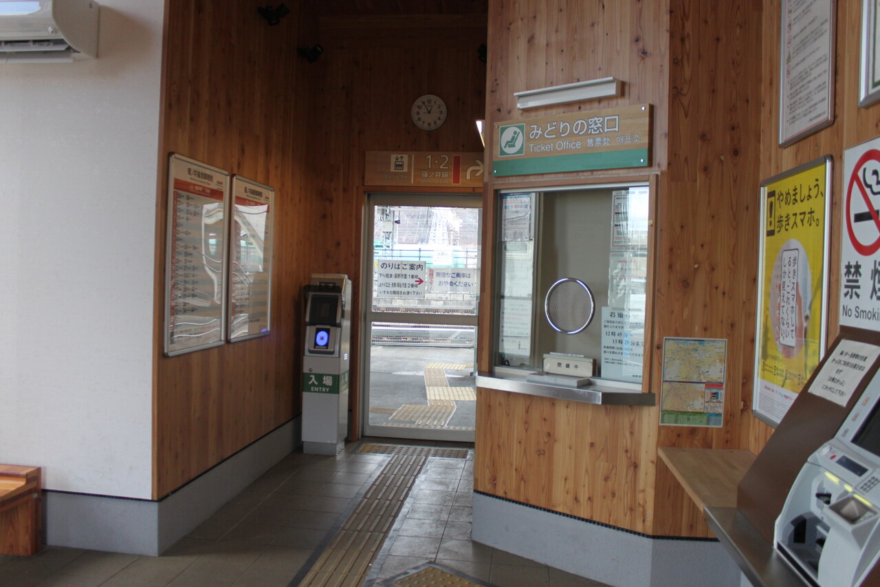 改札口です。以前は左側にあったきっぷ売場ですが駅舎改築(左側撤去)に伴い右側へ移設されています。こういう場合、一旦古い駅舎を撤去して新築させるパターンが多いのかと思いきや、リノベーションを選択するあたり、ものを大切にする精神を感じます。