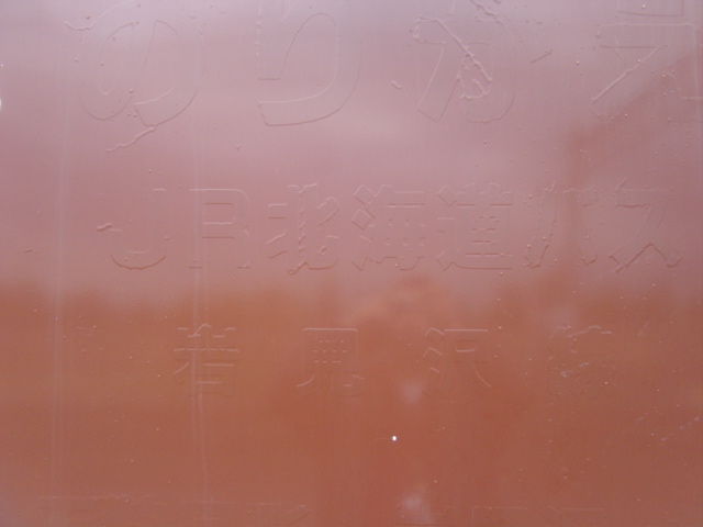 一見すると単なるチョコレート色をした看板にしか見えませんが、よ~く見るとうっすらと「のりかえ JR北海道バス 岩見沢・石狩月形方面」と書かれているのがわかりますか???