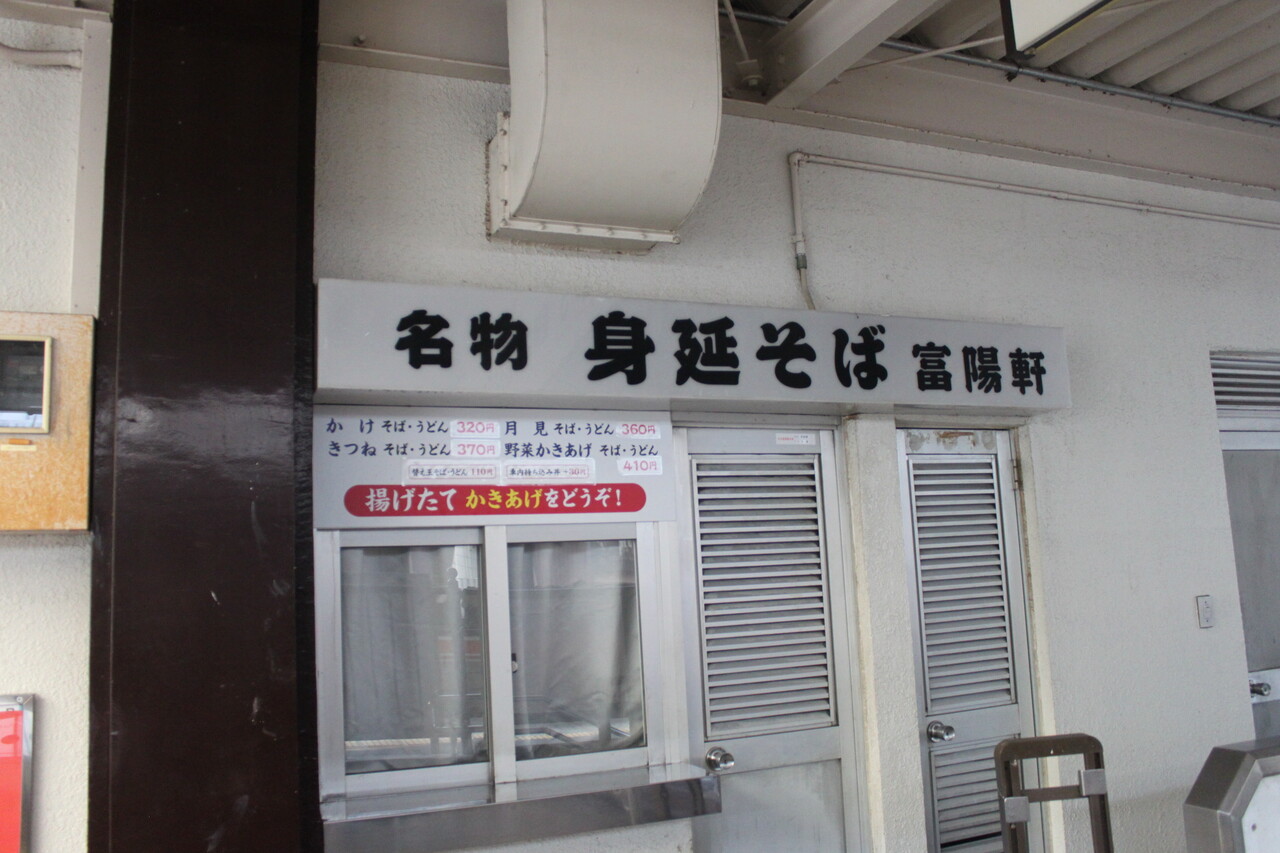 1番線ホーム側には「名物身延そば 富陽軒」の看板が出ていますが、残念ながら営業をしておらず、「休業」なのか「閉業」なのかは不明ですが、閉業なら看板類は直ちに撤去しそうなものですがそうでもなく、休業なのかなと。なお、当駅のそば屋さん営業は駅舎改築の昭和55年から行われていたようですが、この看板に出ている富陽軒さんの公式サイトによると駅弁販売とそば屋営業を平成28年より開始した旨、公式サイトでアピールをしています。