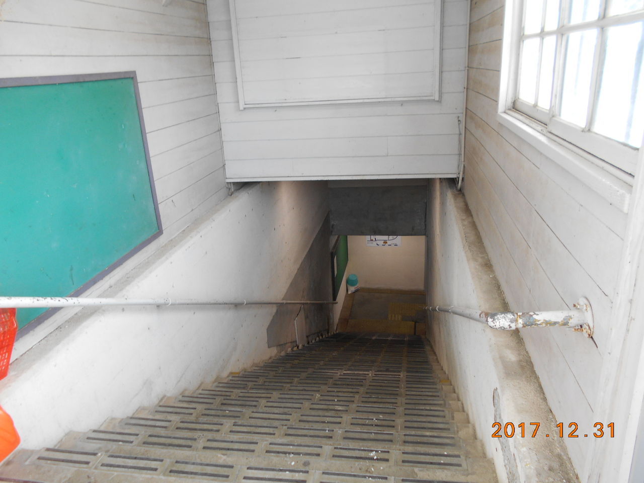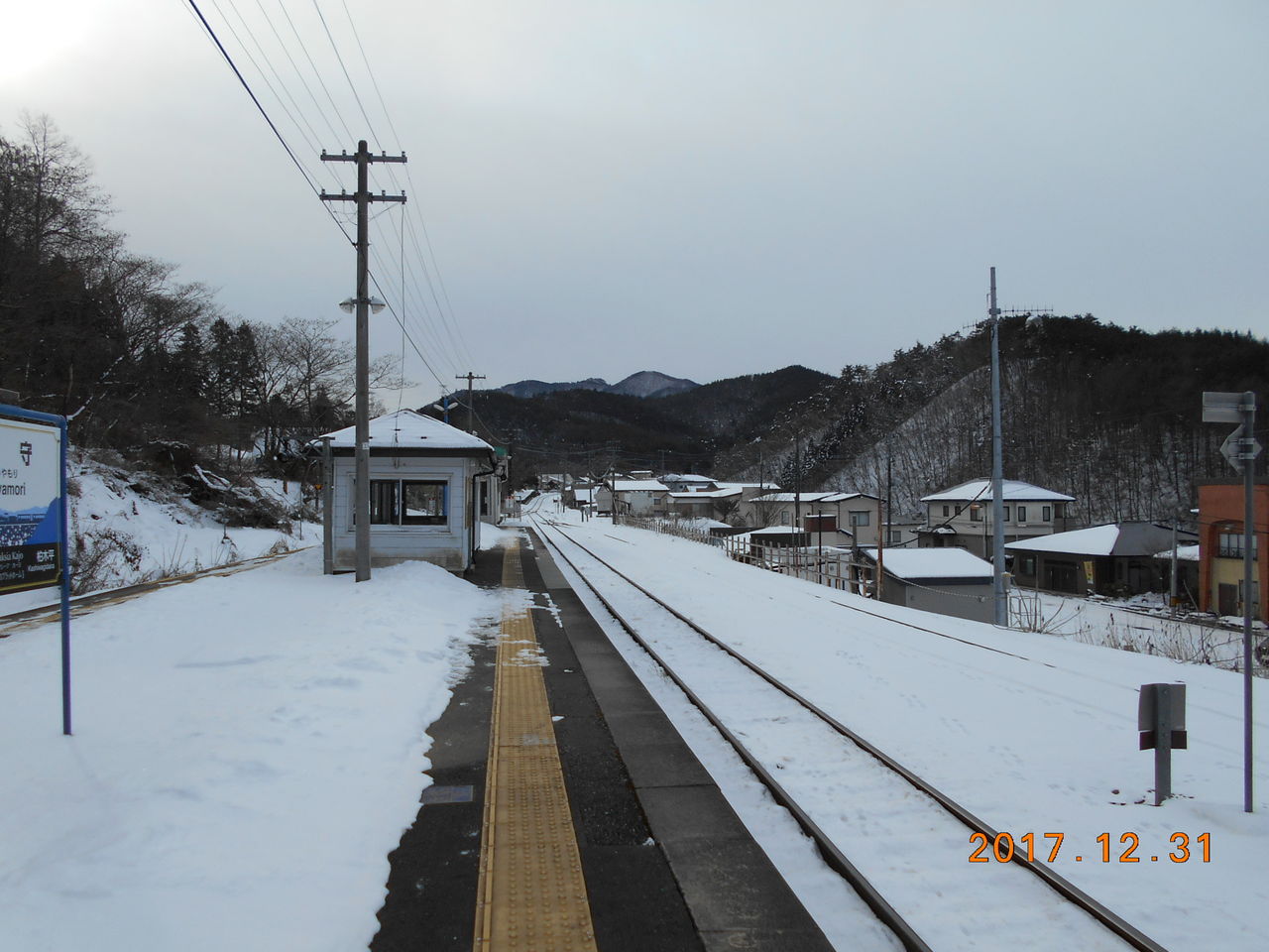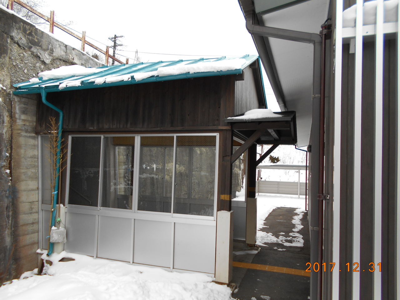 ホームは築堤上にあり、駅舎がある地上とは地下道っぽい階段を通ります。階段だけだと降雪時にとても辛いのでホームの階段上に木造の建物を被せています。